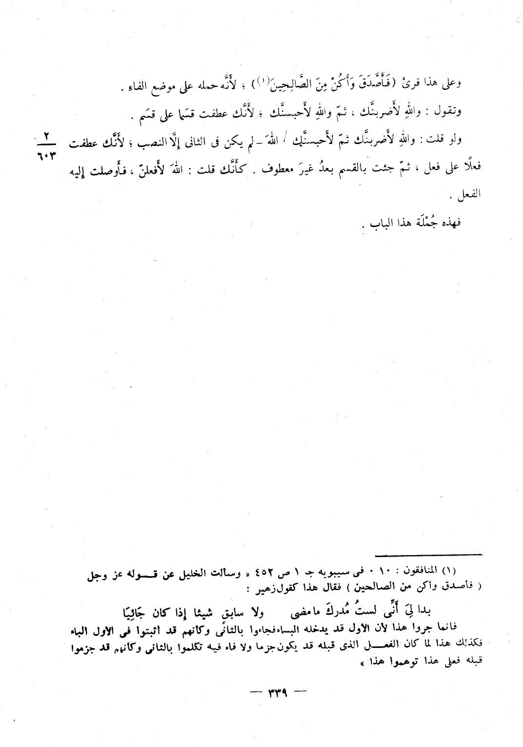 وَاعْلَم أَنه لَا يحسن أَن يَلِي إنَّ أنَّ لِأَن الْمَعْنى وَاحِد كَمَا لَا تَقول لَئِن زيدا منطلق لِأَن اللَّام فِي معنى إنَّ فَإِن فصلت بَينهمَا بِشَيْء حسن واستقام فَقلت إنَّ فِي الدَّار لزيدا وَلَا تَقول إنّ لزيدا فِي الدَّار بل تَقول كَمَا قَالَ عز وَجل {إِن فِي ذَلِك لآيَة} وعَلى هَذَا لَا تَقول إنّ أنَّ زيدا منطلق بَلغنِي وَلَكِن لَو قلت إنَّ فِي الدَّار أَنَّك منطلق وإنّ فِي الدَّار أنّ لَك ثوبا حسن كَمَا قَالَ الله عز وَجل {إنَّ لَكَ أنَّ لَا تَجُوعَ فِيها وَلَا تَعْرى وأنَّكَ لَا تَظْمَأُ فِيها وَلاَ تَضْحى} وَيجوز {وَأَنَّك لَا تظمأ فِيهَا} على الْقطع والابتداء فَالْأولى على قَوْلك ضربت زيدا وعمرا قَائِما وَالْقطع على قَوْلك ضربت زيدا وَعَمْرو قَائِم
