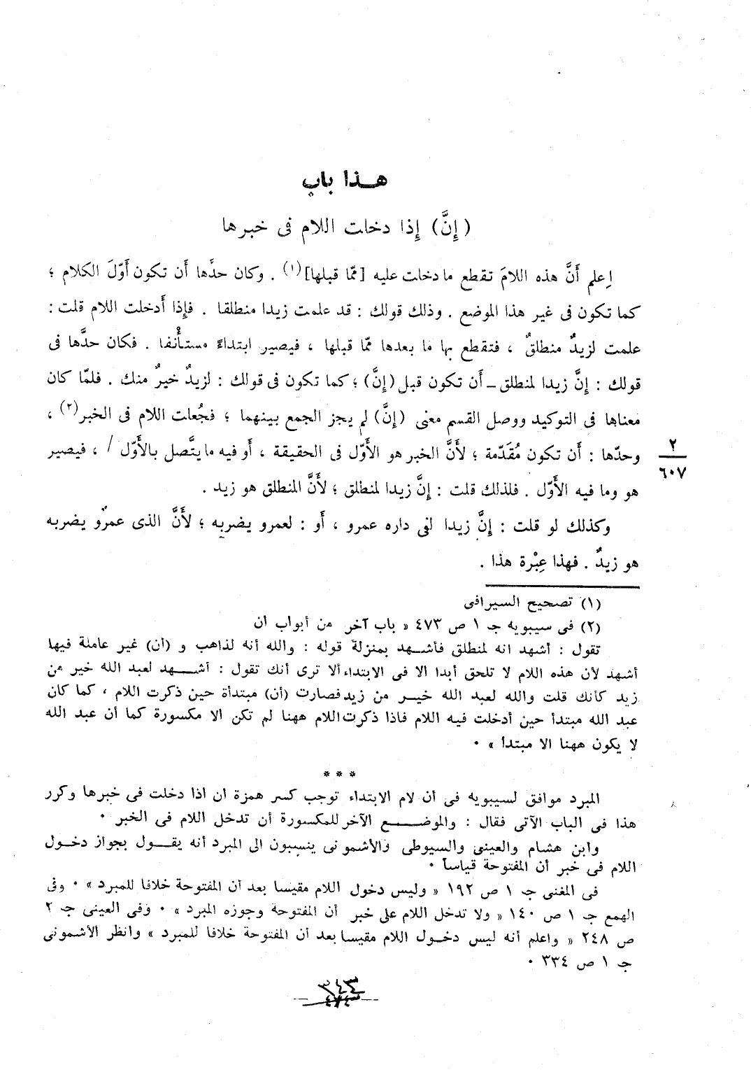 فَإِذا قلت جئْتُك أَنَّك تحب الْمَعْرُوف فَالْمَعْنى معنى اللَّام فعلى هَذَا قدمت وَهَذَا قد مر فَهَذَا قَول الْخَلِيل والموضع الآخر للمكسورة أَن تدخل اللَّام فِي الْخَبَر وَقد مضى قَوْلنَا فِي هَذَا لِأَن اللَّام تقطعها مِمَّا قبلهَا فَتكون مُبتَدأَة فَهَذَا مِمَّا ذكرت لَك أَنَّهَا ترجع إِلَى الِابْتِدَاء والموضع الثَّالِث أَن تقع بعد القَوْل حِكَايَة فَتكون مُبتَدأَة كَمَا تَقول قَالَ زيد عَمْرو منطلق وَقلت الله أكبر وَقد مضى هَذَا فِي بَاب الْحِكَايَة