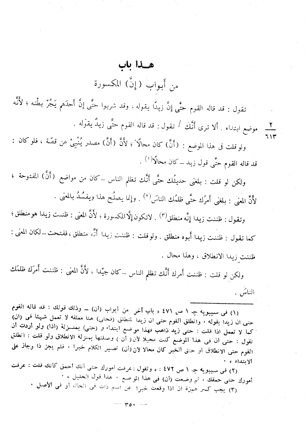 تَقول يَوْم الْجُمُعَة أَنْت خَارج وَالْيَوْم أَنَّك راحل وَلَك على أَنَّك لَا تؤذي لِأَنَّهُ أَرَادَ يَوْم الْجُمُعَة خُرُوجك وَفِي يَوْم الْجُمُعَة رحلتك وَلَك على ترك الْأَذَى أَلا ترى أَنَّك لَو وضعت ذَاك فِي هَذَا الْموضع لصلح فَكنت تَقول فِي يَوْم الْجُمُعَة ذَاك وَلَك على ذَاك فَإِن قَالَ قَائِل هَل يجوز الْيَوْم انك منطلق وَلَك على إِنَّك لَا تؤذي فَإِن ذَلِك غير جَائِز لِأَنَّك تُرِيدُ التَّقْدِيم وَالتَّأْخِير فَيكون على قَوْلك إِنَّك منطلق الْيَوْم وَإنَّك لَا تؤذي لَك على وَإِن رحلتك يَوْم الْجُمُعَة وَإِنَّمَا فسد لِأَن إِن لَا يصلح فِيهَا التَّقْدِيم وَالتَّأْخِير كَمَا لم يصلح ذَلِك فِيمَا تعْمل فِيهِ من الْأَسْمَاء إِذا كَانَت مَكْسُورَة فَإِذا كَانَت مَفْتُوحَة جَازَ فِيهَا التَّقْدِيم وَالتَّأْخِير أَعنِي تَقْدِيم الْخَبَر وتأخيره لِأَنَّهَا مَوْضُوعَة مَوضِع الْمصدر وَتقول أما يَوْم الْجُمُعَة فَإنَّك مرتحل لِأَن معنى أما مهما يكن من شَيْء فَإنَّك مرتحل يَوْم الْجُمُعَة فَمَا بعد الْفَاء يَقع مُبْتَدأ أَلا ترى أَنَّك تَقول أما زيدا فضريت فَإِنَّمَا
