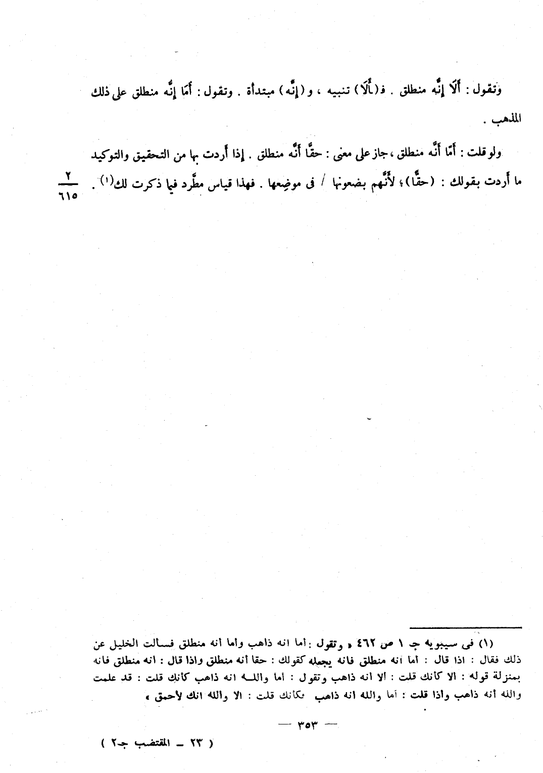 إنَّ المَوْتَ الَّذي تُفِرُّونَ مِنْهُ فإنَّهُ مُلاقيكُم} فإنَّ فِي هَذَا الْموضع يجوز أَن تكون الأولى الَّتِي وَقعت بعد الْحِكَايَة كررت وَيجوز أَن تكون وَقعت مُبتَدأَة بعد الْفَاء كَقَوْلِك من يأتني فَإِنِّي سأكرمه وَأما أَبُو الْحسن الْأَخْفَش فَقَالَ فِي قَوْله تبَارك وَتَعَالَى {ألَمْ يعْلَموا أّنَّهُ مَنْ يُحادِدِ اللهَ وَرَسُولَهُ فَأنَّ لَهُ نارُ جَهَنَّمَ} قَالَ الْمَعْنى فَوَجَبَ النَّار لَهُ ثمَّ وضع أَن فِي مَوضِع الْمصدر فَهَذَا قَول لَيْسَ بِالْقَوِيّ لِأَنَّهُ يفتحها مُبتَدأَة ويضمر الْخَبَر وَكَذَلِكَ قَالَ فِي قَوْله {كَتَبَ رَبَّكُمْ على نَفْسِهِ الرَحْمَةَ أنَّهُ مَنْ عَمِلَ مِنْكُمْ سُوءاً بِجَهالَةِ ثُّمَ تَابَ مِنْ بعدِهِ وأصْلَحَ فَأَنَّهُ غَفورٌ رَحيمٌ} أَي فَوَجَبَ الرَّحْمَة لَهُ وَالْقَوْل فِيهِ عندنَا التكرير على مَا ذكرت لَك فَأَما مَا قيل فِي الْآيَة الَّتِي ذكرنَا قبل سوى القَوْل الَّذِي اخترناه وَهِي {أيعدكم أَنكُمْ إِذا متم وكنتم تُرَابا وعظاما أَنكُمْ مخرجون} فَإِن يكون {أَنكُمْ مخرجون} مرتفعا بالظرف كَأَنَّهُ فِي التَّقْدِير أيعدكم أَنكُمْ إِذا متم إخراجكم فَهَذَا قَول حسن جميل