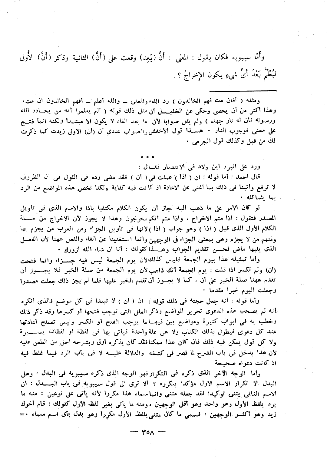 {وَانْطَلق الْمَلأ مِنْهُم أَن امشوا واصبروا على آلِهَتكُم} وَمثله بنيت الحَدِيث أَن قد كَانَ كَذَا وَكَذَا وتريد أَي امشوا وَأي قد كَانَ كَذَا وَكَذَا وَوجه رَابِع أَن تكون زَائِدَة مُؤَكدَة وَذَلِكَ قَوْلك لما أَن جَاءَ زيد قُمْت وَوَاللَّه أَن لَو فعلت لأكرمك وَأما إِن الْمَكْسُورَة فَإِن لَهَا أَرْبَعَة أوجه مُخَالفَة لهَذِهِ الْوُجُوه فَمن ذَلِك إِن الْجَزَاء وَذَلِكَ قَوْلك إِن تأتني آتِك وَهِي أصل الْجَزَاء كَمَا أَن الْألف أصل الِاسْتِفْهَام وَتَكون فِي معنى مَا تَقول عَن أَن زيد منطلق أَي مَا زيد منطلق وَكَانَ سِيبَوَيْهٍ لَا يرى فِيهَا إِلَّا رفع الْخَبَر لِأَنَّهَا حرف نفي دخل على ابْتِدَاء وَخَبره كَمَا تدخل ألف الِاسْتِفْهَام فَلَا تغيره وَذَلِكَ لمَذْهَب بني تَمِيم فِي مَا وَغَيره يُجِيز نصب الْخَبَر على تَشْبِيه بِلبْس كَمَا فعل ذَلِك فِي مَا وَهَذَا هُوَ القَوْل لِأَنَّهُ لَا فصل بَينهَا وَبَين مَا فِي الْمَعْنى وَذَلِكَ قَوْله عز وَجل {إنِ الكَافِرِونَ إلاّ فِي غٌ رُورِ} وَقَالَ {إِن يَقُولُونَ إِلَّا كذبا} فهذان موضعان