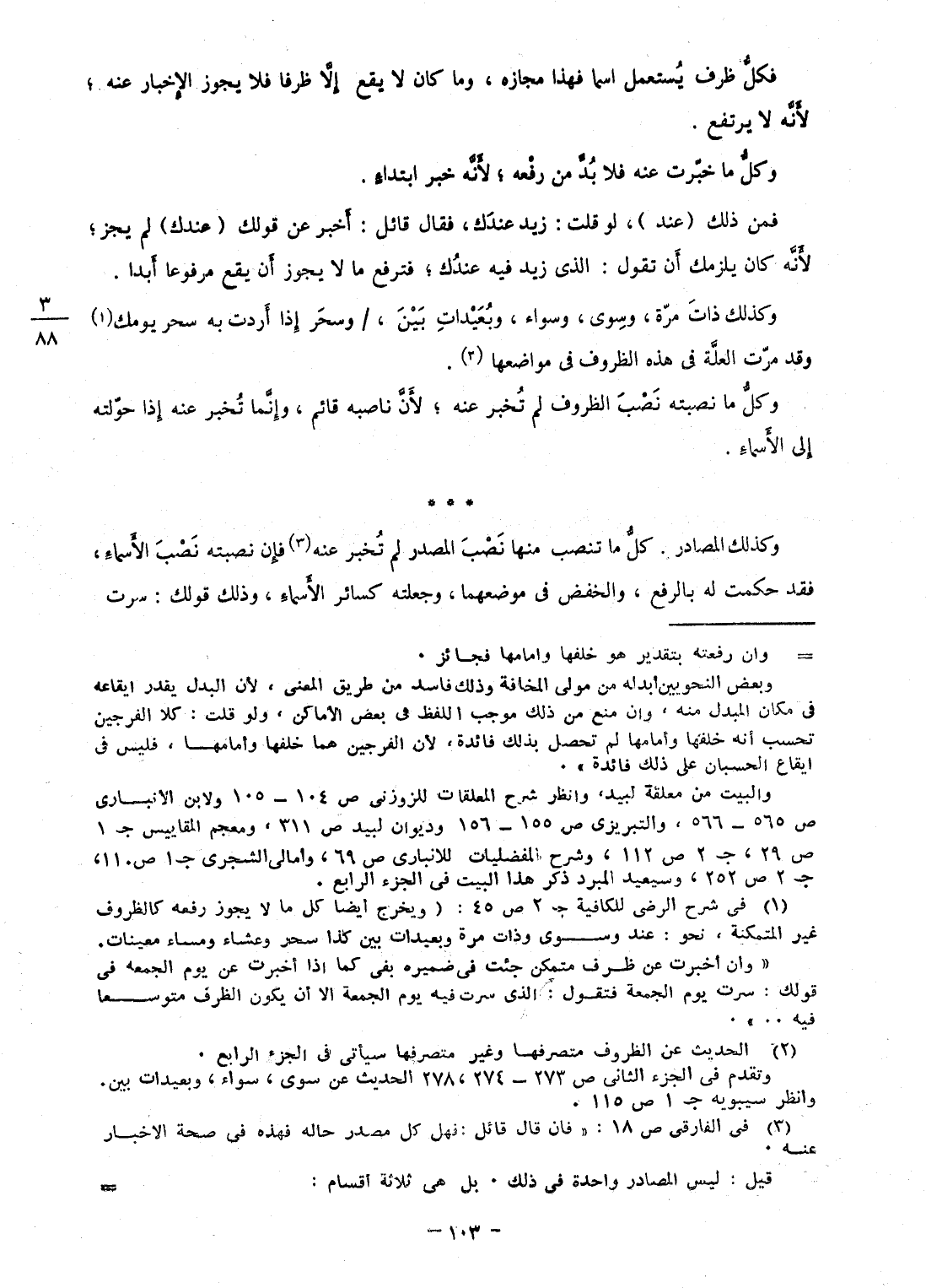 فَكل ظرف يسْتَعْمل اسْما فَهَذَا مجازه، وَمَا كَانَ لَا يَقع إِلَّا ظرفا فَلَا يجوز الْإِخْبَار عَنهُ؛ لِأَنَّهُ لَا يرْتَفع وكل مَا خبرت عَنهُ فَلَا بُد من رَفعه؛ لِأَنَّهُ خبر ابْتِدَاء فَمن ذَلِك (عِنْد) ، لَو قلت: زيد عنْدك، فَقَالَ قَائِل: أخبر عَن قَوْلك (عنْدك) لم يجز؛ لِأَنَّهُ كَانَ يلزمك أَن تَقول: الذى زيد فِيهِ عنْدك؛ فَترفع مَا لَا يجوز أَن يَقع مَرْفُوعا أبدا وَكَذَلِكَ ذَات مرّة، وَسوى، وَسَوَاء، وبعيدات بَين، / وسحر إِذا أردْت بِهِ سحر يَوْمك وَقد مرت الْعلَّة فى هَذِه الظروف فى موَاضعهَا وكل مَا نصبته نصب الظروف لم تخبر عَنهُ؛ لِأَن ناصبه قَائِم، وَإِنَّمَا تخبر عَنهُ إِذا حولته إِلَى الْأَسْمَاء وَكَذَلِكَ المصادر كل مَا تنصب مِنْهَا نصب الْمصدر لم تخبر عَنهُ فَإِن نصبته نصب الْأَسْمَاء، فقد حكمت لَهُ بِالرَّفْع، والخفض فى موضعهما، وَجَعَلته كَسَائِر الْأَسْمَاء، وَذَلِكَ قَوْلك: سرت