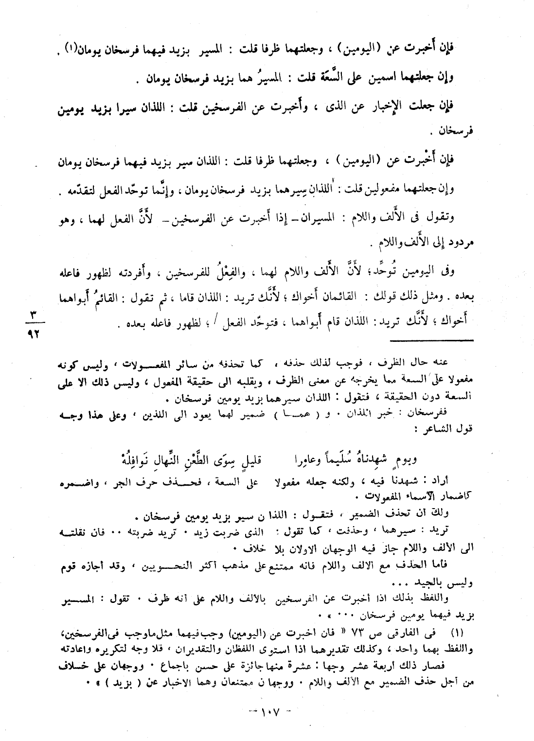 فَإِن أخْبرت عَن (الْيَوْمَيْنِ) ، وجعلتهما ظرفا قلت: الْمسير بزيد فيهمَا فرسخان يَوْمَانِ وَإِن جعلتهما اسْمَيْنِ على السعَة قلت: الْمسير هما بزيد فرسخان يَوْمَانِ فَإِن جعلت الْإِخْبَار عَن الذى، وأخبرت عَن الفرسخين قلت: اللَّذَان سيرا بزيد يَوْمَيْنِ فرسخان فَإِن أخْبرت عَن (الْيَوْمَيْنِ) ، وجعلتهما ظرفا قلت: اللَّذَان سير بزيد فيهمَا فرسخان يَوْمَانِ وَإِن جعلتهما مفعولين قلت: اللَّذَان سيرهما بزيد فرسخان يَوْمَانِ، وَإِنَّمَا توَحد الْفِعْل لتقدمه وَتقول فى الْألف وَاللَّام: المسيران - إِذا أخْبرت عَن الفرسخين - لِأَن الْفِعْل لَهما، وَهُوَ مَرْدُود إِلَى الْألف وَاللَّام وفى الْيَوْمَيْنِ توَحد؛ لِأَن الْألف وَاللَّام لَهما، وَالْفِعْل للفرسخين، وأفردته لظُهُور فَاعله بعده وَمثل ذَلِك قَوْلك: القائمان أَخَوَاك؛ لِأَنَّك تُرِيدُ: اللَّذَان قاما، ثمَّ تَقول: الْقَائِم أبواهما أَخَوَاك؛ لِأَنَّك تُرِيدُ: اللَّذَان قَامَ أبواهما، فتوحد الْفِعْل /؛ لظُهُور فَاعله بعده