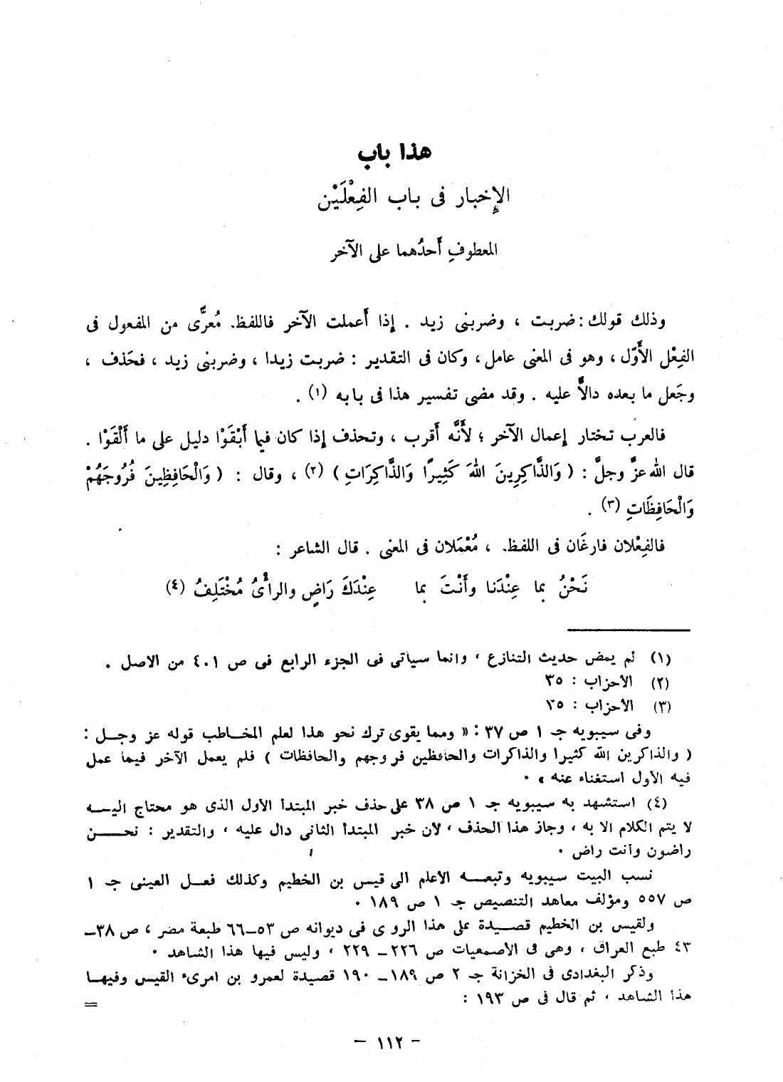 وَذَلِكَ قَوْلك: ضربت، وضربنى زيد إِذا أعلمت الآخر فاللفظ معرى من الْمَفْعُول فى الْفِعْل الأول، وَهُوَ فى الْمَعْنى عَامل، وَكَانَ فى التَّقْدِير: ضربت زيدا، وضربنى زيد، فَحذف، وَجعل مَا بعده دَالا عَلَيْهِ وَقد مضى تَفْسِير هَذَا فى بَابه فالعرب تخْتَار إِعْمَال الآخر؛ لِأَنَّهُ أقرب، وتحذف إِذا كَانَ فِيمَا أَبقوا دَلِيل على مَا ألقوا قَالَ الله عز وَجل: {والذاكرين الله كثيرا وَالذَّاكِرَات} ، وَقَالَ: {والحافظين فروجهم والحافظات} فالفعلان فارغان فى اللَّفْظ، معملان فى الْمَعْنى قَالَ الشَّاعِر: