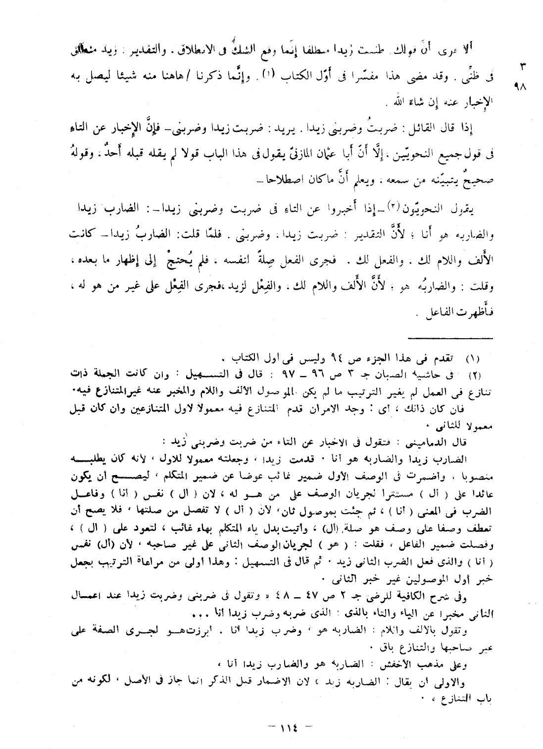 أَلا ترى أَن قَوْلك ظَنَنْت زيدا مُنْطَلقًا إِنَّمَا وَقع الشَّك فى الانطلاق، وَالتَّقْدِير زيد منطلق فى ظنى وَقد مضى هَذَا مُفَسرًا فى أول الْكتاب وَإِنَّمَا ذكرنَا / هَاهُنَا مِنْهُ شَيْئا ليصل بِهِ الْإِخْبَار عَنهُ إِن شَاءَ الله إِذا قَالَ الْقَائِل: ضربت وضربنى زيدا يُرِيد: ضربت زيدا وضربنى - فَإِن الْأَخْبَار عَن التَّاء فى قَول جَمِيع النَّحْوِيين، إِلَّا أَن أَبَا عُثْمَان المازنى يَقُول فى هَذَا الْبَاب قولا لم يقلهُ أحد، وَقَوله صَحِيح يتبينه من سَمعه، وَيعلم أَن مَا كَانَ اصْطِلَاحا - يَقُول النحويون - إِذا أخبروا عَن التَّاء فى ضربت وضربنى زيدا -: الضَّارِب زيدا والضاربة هُوَ أَنا؛ لِأَن التَّقْدِير: ضربت زيدا، وضربنى فَلَمَّا قلت: الضَّارِب زيدا - كَانَت الْألف وَاللَّام لَك، وَالْفِعْل لَك، فَجرى الْفِعْل صلَة لنَفسِهِ، فَلم يحْتَج إِلَى إِظْهَار مَا بعده، وَقلت: والضاربه هُوَ؛ لِأَن الْألف وَاللَّام لَك، وَالْفِعْل لزيد فَجرى الْفِعْل على غير من هُوَ لَهُ، فأظهرت الْفَاعِل