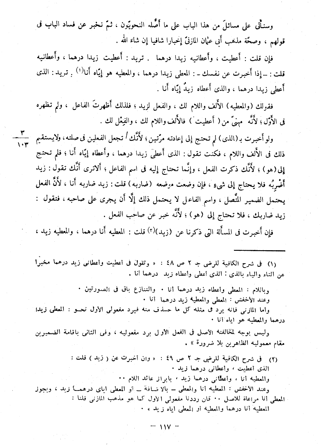 وسنأتى على مسَائِل من هَذَا الْبَاب على مَا أَصله النحويون، ثمَّ نخبر عَن فَسَاد الْبَاب فى قَوْلهم، وَصِحَّة مَذْهَب أَبى عُثْمَان المازنى إِخْبَار شافيا إِن شَاءَ الله فَإِن قلت: أَعْطَيْت، وأعطانيه زيدا درهما تُرِيدُ: أَعْطَيْت زيدا درهما، وأعطانيه قلت: - إِذا أخْبرت عَن نَفسك -: الْمُعْطى زيدا درهما، والمعطيه هُوَ إِيَّاه أَنا: تُرِيدُ: الَّذِي أعْطى زيدا درهما، والذى أعطَاهُ زيد إِيَّاه أَنا فقولك (والمعطيه) الْألف وَاللَّام لَك، وَالْفِعْل لزيد؛ فَلذَلِك أظهرت الْفَاعِل، وَلم تظهره فى الأول؛ لِأَنَّهُ مبْنى من (أَعْطَيْت) فالألف وَاللَّام لَك، وَالْفِعْل لَك وَلَو أخْبرت ب (الذى) لم تحتج إِلَى إِعَادَته مرَّتَيْنِ؛ لِأَنَّك / تجْعَل الْفِعْلَيْنِ فى صلته، وَلَا يَسْتَقِيم ذَلِك فى الْألف وَاللَّام، فَكنت تَقول: الذى أعْطى زيدا درهما، وَأَعْطَاهُ إِيَّاه أَنا؛ فَلم تحتج إِلَى (هُوَ) ؛ لِأَنَّك ذكرت الْفِعْل، وَإِنَّمَا تحْتَاج إِلَيْهِ فى اسْم الْفَاعِل؛ أَلا ترى أَنَّك تَقول: زيد أضربه فَلَا يحْتَاج إِلَى شئ، فَإِن وضعت مَوْضِعه (ضاربه) قلت: زيد ضاربه أَنا، لِأَن الْفِعْل يحْتَمل الضَّمِير الْمُتَّصِل، وَاسم الْفَاعِل لَا يحْتَمل ذَلِك إِلَّا أَن يجرى على صَاحبه، فَتَقول: زيد ضاربك، فَلَا تحْتَاج إِلَى (هُوَ) ؛ لِأَنَّهُ خبر عَن صَاحب الْفِعْل فَإِن أخْبرت فى الْمَسْأَلَة الَّتِى ذكرنَا عَن (زيد) قلت: المعطيه أَنا درهما، والمعطيه زيد،