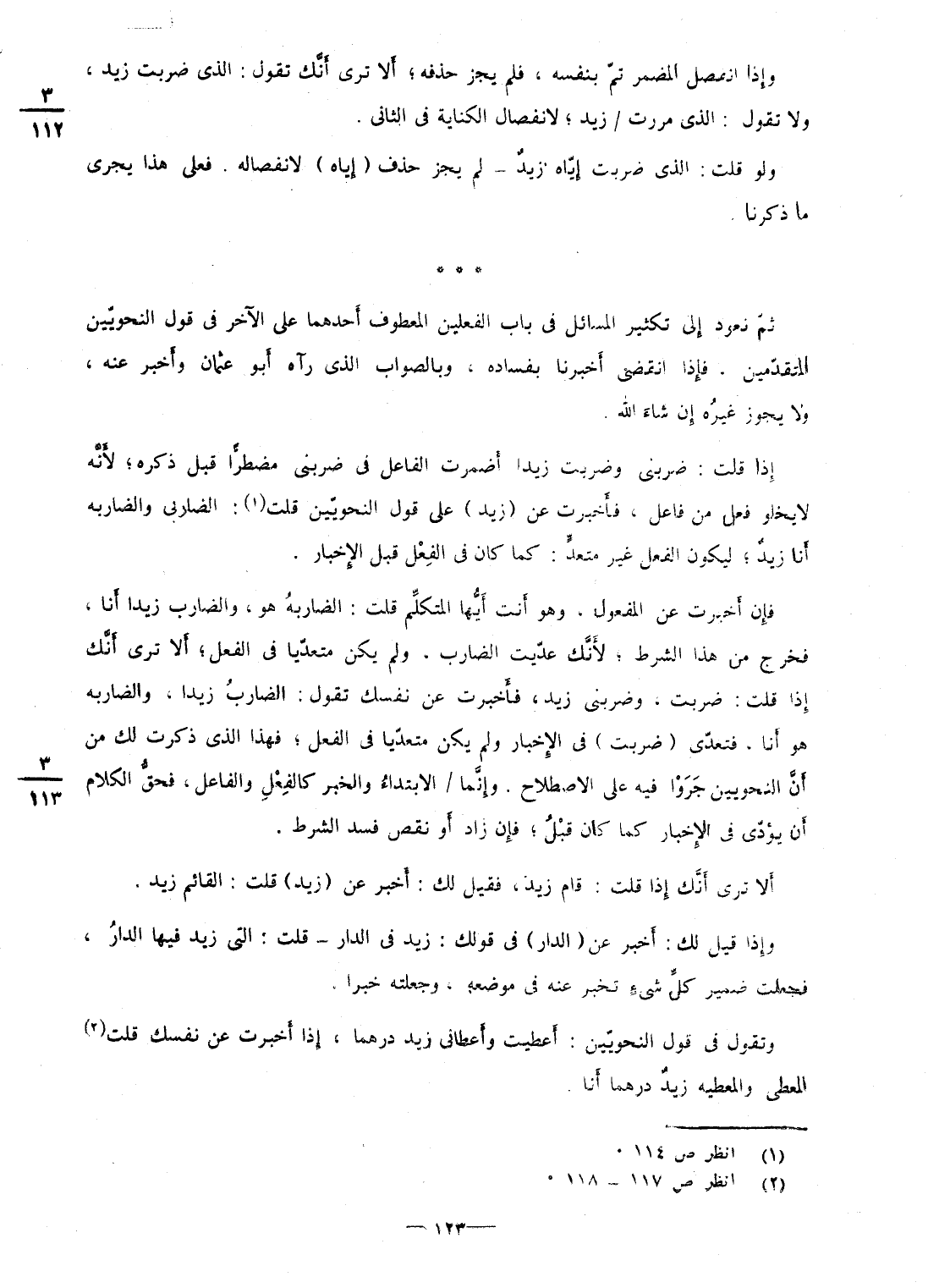 وَإِذا انْفَصل الْمُضمر تمّ بِنَفسِهِ، فَلم يجز حذفه؛ أَلا ترى أَنَّك تَقول: الذى ضربت زيد، وَلَا تَقول: الذى مَرَرْت / زيد؛ لانفصال الْكِنَايَة فى الثانى وَلَو قلت: الذى ضربت إِيَّاه زيد - لم يجز حذف (إِيَّاه) لانفصاله فعلى هَذَا يجرى مَا ذكرنَا ثمَّ نعود إِلَى تَكْثِير الْمسَائِل فى بَاب الْفِعْلَيْنِ الْمَعْطُوف أَحدهمَا على الآخر فى قَول النَّحْوِيين الْمُتَقَدِّمين فَإِذا انْقَضى أخبرنَا بفساده، وبالصواب الذى رَآهُ أَبُو عُثْمَان وَأخْبر عَنهُ، وَلَا يجوز غَيره إِن شَاءَ الله إِذا قلت: ضربنى وَضربت زيدا أضمرت الْفَاعِل فى ضربنى مُضْطَرّا قبل ذكره؛ لِأَنَّهُ لَا يَخْلُو فعل من فَاعل، فَأخْبرت عَن (زيد) على قَول النَّحْوِيين قلت: الضاربى والضاربه أَنا زيد؛ ليَكُون الْفِعْل غير مُتَعَدٍّ: كَمَا كَانَ فى الْفِعْل قبل الْإِخْبَار فَإِن أخْبرت عَن الْمَفْعُول، وَهُوَ أَنْت أَيهَا الْمُتَكَلّم قلت: الضاربه هُوَ، والضارب زيد أَنا، فَخرج من هَذَا الشَّرْط؛ لِأَنَّك عديت الضَّارِب، وَلم يكن مُتَعَدِّيا فى الْفِعْل؛ أَلا ترى أَنَّك إِذا قلت: ضربت، وضربنى زيد، فَأخْبرت عَن نَفسك تَقول: الضَّارِب زيدا، والضاربه هُوَ أَنا، فتعدى (ضربت) فى الْأَخْبَار وَلم يكن مُتَعَدِّيا فى الْفِعْل؛ فَهَذَا الذى ذكرت لَك من أَن النَّحْوِيين جروا فِيهِ على الِاصْطِلَاح وَإِنَّمَا / الِابْتِدَاء وَالْخَبَر كالفعل وَالْفَاعِل، فَحق الْكَلَام أَن يُؤدى فى الْإِخْبَار كَمَا كَانَ قبل؛ فَإِن زَاد أَو نقص فسد الشَّرْط أَلا ترى أَنَّك إِذا قلت: قَامَ زيد، فَقيل لَك: أخبر عَن (زيد) قلت: الْقَائِم زيد وَإِذا قيل لَك: أخبر عَن (الدَّار) فى قَوْلك: زيد فى الدَّار - قلت: الَّتِى زيد فِيهَا الدَّار، فَجعلت ضمير كل شئ تخبر عَنهُ فى مَوْضِعه، وَجَعَلته خَبرا وَتقول فى قَول النَّحْوِيين: أَعْطَيْت وأعطانى زيد درهما، إِذا أخْبرت عَن نَفسك قلت الْمُعْطى والمعطيه زيد درهما أَنا