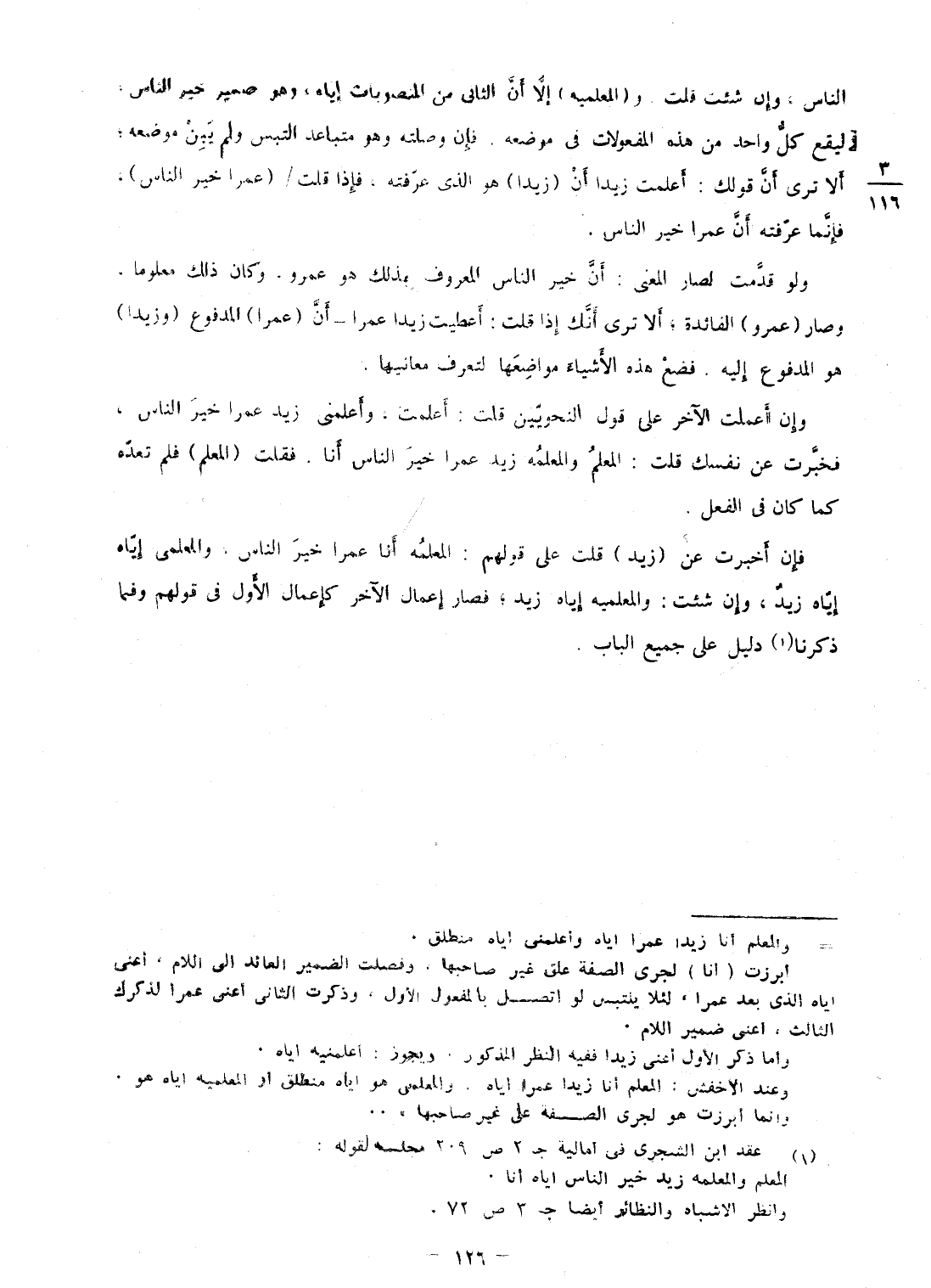 النَّاس، وَإِن شِئْت قلت، و (العلميه) إِلَّا أَن الثانى من المنصوبات إِيَّاه، وَهُوَ ضمير خير النَّاس ليَقَع كل وَاحِد من هَذِه المفعولات فى مَوْضِعه فَإِن وصلته وَهُوَ متباعد الْتبس وَلم يبن مَوضِع أَلا ترى أَن قَوْلك: أعلمت زيدا أَن (زيدا) هُوَ الذى عَرفته، فَإِذا قلت / (عمرا خير النَّاس) فَإِنَّمَا عَرفته أَن عمرا خير النَّاس وَلَو قدمت لصار الْمَعْنى: أَن خير النَّاس الْمَعْرُوف بذلك هُوَ عَمْرو وَكَانَ ذَلِك مَعْلُوما وصل (عَمْرو) الْفَائِدَة؛ أَلا ترى أَنَّك إِذا قلت: أَعْطَيْت زيدا عمرا - أَن (عمرا) الْمَدْفُوع (وزيدا) هُوَ الْمَدْفُوع إِلَيْهِ فضع هَذِه الْأَشْيَاء موَاضعهَا لتعرف مَعَانِيهَا وَإِن أعلمت الآخر على قَول النَّحْوِيين قلت: أعلمت، وأعلمني زيد عمرا خير النَّاس، فخبرت عَن نَفسك قلت: الْمعلم والمعلمه زيد عمرا خير النَّاس أَنا فَقلت (الْمعلم) فَلم تعده كَمَا كَانَ فى الْفِعْل فَإِن أخْبرت عَن (زيد) قلت على قَوْلهم: المعلمه أَنا عمرا خير النَّاس والمعلمى إِيَّاه إِيَّاه زيد، وَإِن شِئْت: والمعلمه إِيَّاه زيد؛ فَصَارَ إِعْمَال الآخر كإعمال الأول فى قَوْلهم وَفِيمَا ذكرنَا دَلِيل على جَمِيع الْبَاب