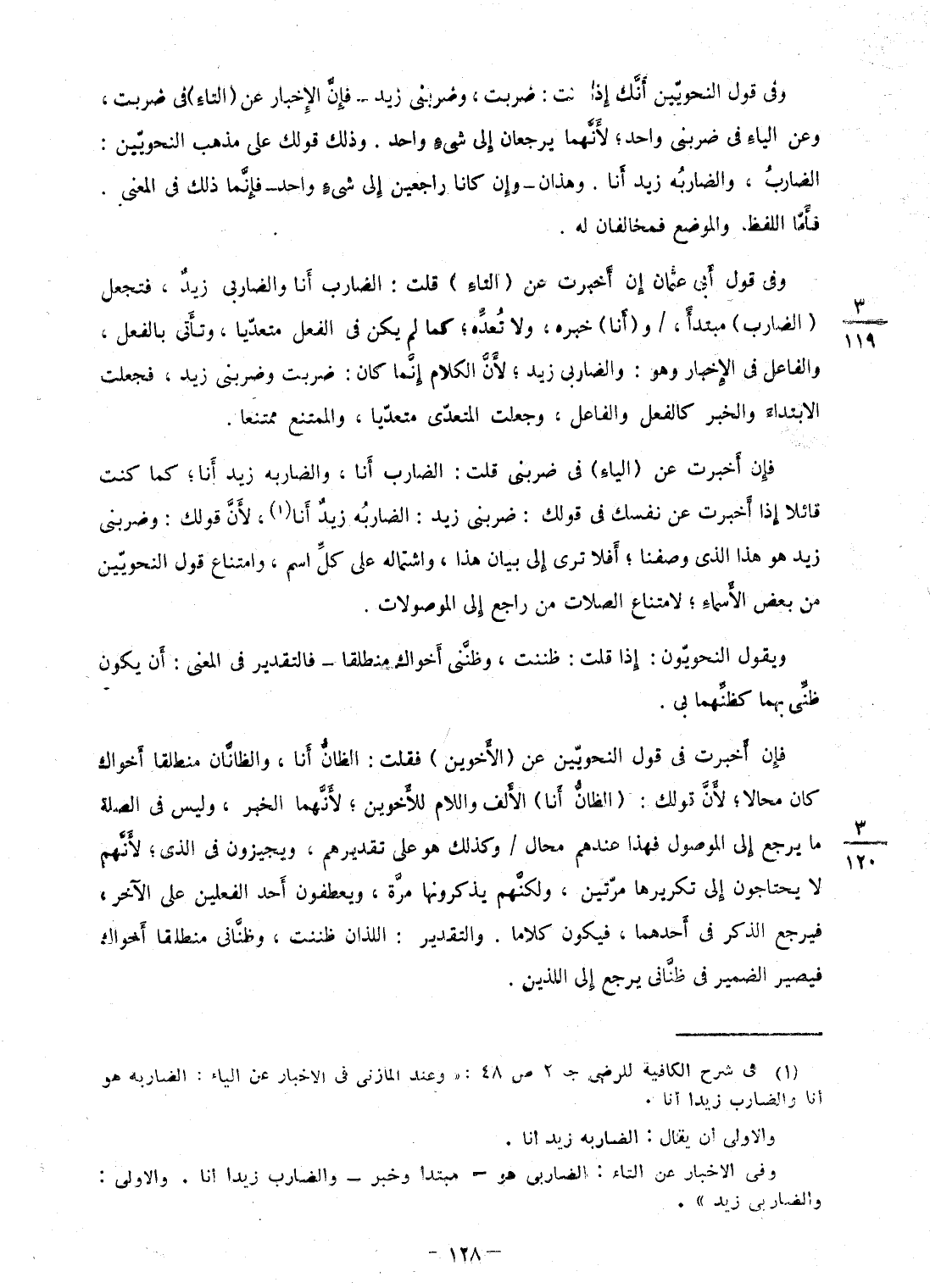 وفى قَول النَّحْوِيين أَنَّك إِذا كنت: ضربت، وضربنى زيد - فَإِن الْإِخْبَار عَن (التَّاء) فى ضربت، وَعَن الْيَاء فى ضربنى وَاحِد؛ لِأَنَّهُمَا يرجعان إِلَى شئ وَاحِد وَذَلِكَ قَوْلك على مَذْهَب النَّحْوِيين: الضَّارِب، والضاربه زيد أَنا وَهَذَانِ - وَإِن كَانَا رَاجِعين إِلَى شئ وَاحِد - فَإِنَّمَا ذَلِك فى الْمَعْنى فَأَما اللَّفْظ والموضع فمخالفان لَهُ وفى قَول أَبى عُثْمَان إِن أخْبرت عَن (التَّاء) قلت: الضَّارِب أَنا والضاربى زيد، فتجعل (الضَّارِب) مُبْتَدأ، / و (أَنا) خَبره، وَلَا تعده؛ كَمَا لم يكن فى الْفِعْل مُتَعَدِّيا، وتأتى بِالْفِعْلِ، وَالْفَاعِل فى الْإِخْبَار وَهُوَ: والضاربى زيد؛ لِأَن الْكَلَام إِنَّمَا كَانَ: ضربت وضربنى زيد، فَجعلت الِابْتِدَاء وَالْخَبَر كالفعل وَالْفَاعِل، وَجعلت المتعدى مُتَعَدِّيا، والممتنع مُمْتَنعا فَإِن أخْبرت عَن (الْيَاء) فى ضربنى قلت: الضَّارِب أَنا، والضاربه زيد أَنا؛ كَمَا كنت قَائِلا إِذا أخْبرت عَن نَفسك فى قَوْلك: ضربنى زيد: الضاربه زيد أَنا، لِأَن قَوْلك: ضربنى زيد هُوَ هَذَا الذى وَصفنَا؛ أَفلا ترى إِلَى بَيَان هَذَا، واشتماله على كل اسْم، وَامْتِنَاع قَول النَّحْوِيين من بعض الْأَسْمَاء لِامْتِنَاع الصلات من رَاجع إِلَى الموصلات وَيَقُول النحويون: إِذا قلت: ظَنَنْت، وظننى أَخَوَاك مُنْطَلقًا - فالتقدير فى الْمَعْنى: أَن يكون ظنى بهما كظنهما بى فَإِن أخْبرت فى قَول النَّحْوِيين عَن (الْأَخَوَيْنِ) فَقلت: الظَّان أَنا، والظانان مُنْطَلقًا أَخَوَاك كَانَ محالا؛ لِأَن قَوْلك: (الظَّان أَنا) الْألف وَاللَّام للأخوين؛ لِأَنَّهُمَا الْخَبَر، وَلَيْسَ فى الصِّلَة مَا يرجع إِلَى الْمَوْصُول فَهَذَا عِنْدهم محَال / وَكَذَلِكَ هُوَ على تقديرهم، ويجيزون فى الذى؛ لأَنهم لَا يَحْتَاجُونَ إِلَى تكريرها مرَّتَيْنِ، وَلَكنهُمْ يذكرونها مرّة، ويعطفون أحد الْفِعْلَيْنِ على الآخر، فَيرجع الذّكر فى أَحدهمَا، فَيكون كلَاما وَالتَّقْدِير: اللَّذَان ظَنَنْت، وظنانى مُنْطَلقًا أَخَوَاك فَيصير الضَّمِير فى ظنانى يرجع إِلَى اللَّذين
