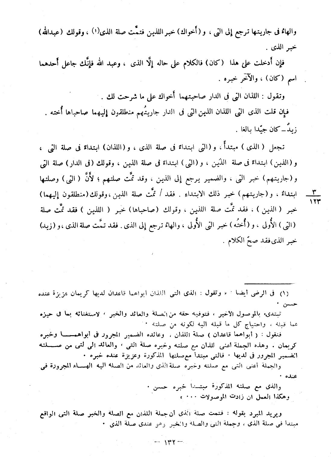وَالْهَاء فى جاريتها ترجع إِلَى الَّتِى، و (أَخَوَاك) خبر اللَّذين فتمت صلَة الذى، وقولك (عبد الله) خبر الذى فَإِن أدخلت على هَذَا (كَانَ) فَالْكَلَام على حَاله إِلَّا الذى، وَعبد الله فَإنَّك جَاعل أَحدهمَا اسْم (كَانَ) ، وَالْآخر خَبره وَتقول: اللَّذَان الَّتِى فى الدَّار صاحبتهما أَخَوَاك على مَا شرحت لَك فَإِن قلت الذى الَّتِى اللَّذَان الَّذين الَّتِى فى الدَّار جاريتهم منطلقون إِلَيْهِمَا صاحباها أُخْته زيد - كَانَ جيدا بَالغا تجْعَل (الذى) مُبْتَدأ، و (الَّتِى ابْتِدَاء فى صلَة الذى، و (اللَّذَان) ابْتِدَاء فى صلَة الَّتِى، و (الَّذين) ابْتِدَاء فى صلَة الَّذين، و (الَّتِى) ابْتِدَاء فى صل الَّذين، وقولك (فى الدَّار) صلَة الَّتِى و (جاريتهم) خبر الَّتِى، وَالضَّمِير يرجع إِلَى الَّذين، وَقد تمت صلتهم؛ لِأَن (الَّتِى) وصلتها ابْتِدَاء، و (جاريتهم) خبر ذَلِك الِابْتِدَاء فقد تمت صل اللَّذين، وقولك منطلقون إِلَيْهِمَا خبر الَّذين فقد تمت صلَة اللَّذين وقولك (صاحباها) خبر (اللَّذين) فقد تمت صلَة (الَّتِى) الأولى، و (أُخْته) خبر الَّتِى الأولى، وَالْهَاء ترجع إِلَى الذى فقد تمت صل الذى، و (زيد) خبر الذى فقد صَحَّ الْكَلَام