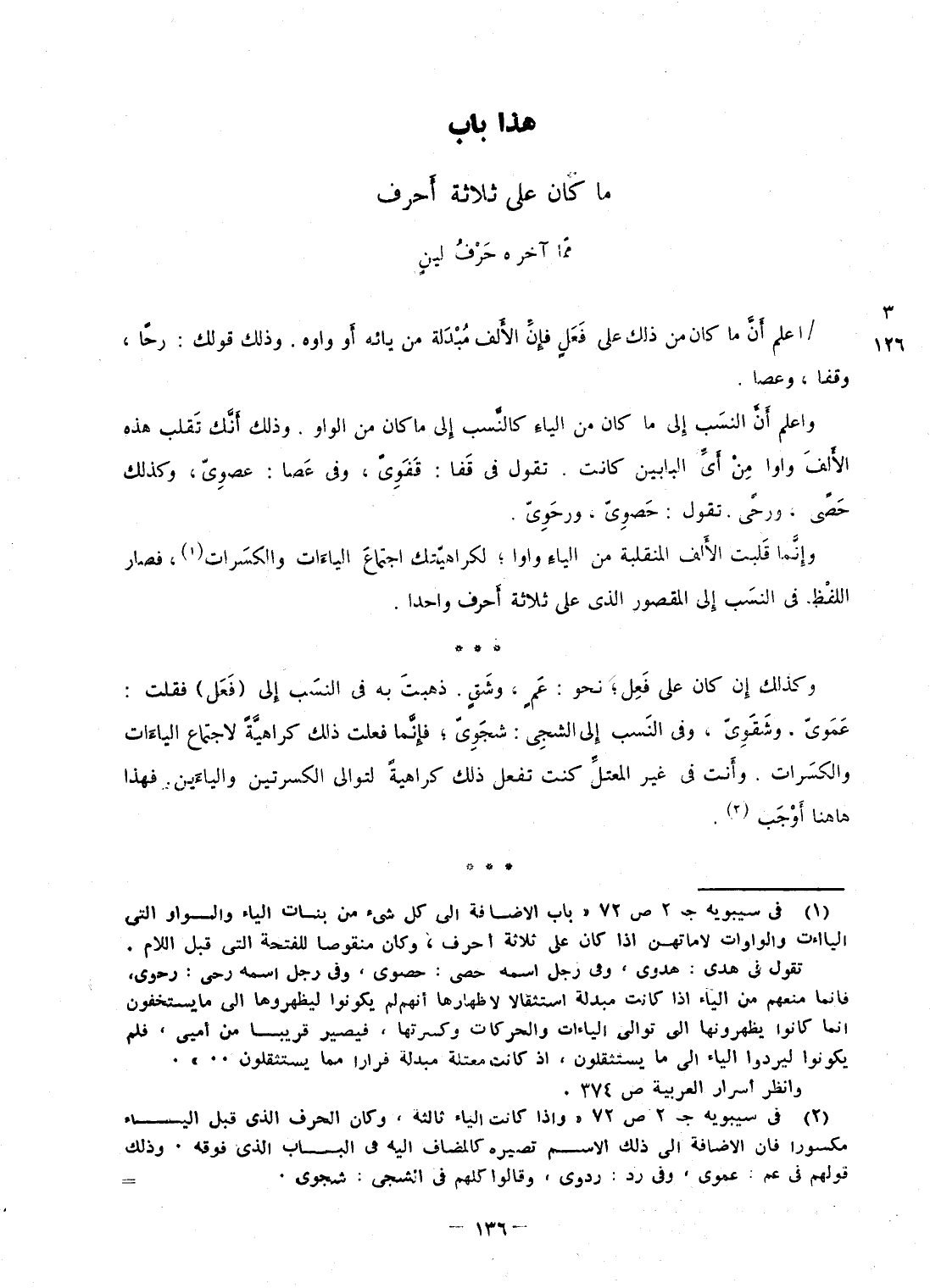 اعْلَم أَن مَا كَانَ من ذَلِك على فعل فَإِن الْألف مبدلة من يائه أَو واوه وَذَلِكَ قَوْلك: رَحا، وَقفا، وعصا: أعلم أَن النّسَب إلة مَا كَانَ من الْيَاء كالنسب إِلَى مَا كَانَ من الْوَاو وَذَلِكَ أَنَّك تقلب هَذِه الْألف واوا من أَي الباببين كَانَت تَقول فِي قفا قفوى وَفِي عَصا عصوى، وَكَذَلِكَ حَصى، ورحى تَقول: حصوى، ورحوى وَإِنَّمَا قلبت الْألف المنقلبة من الْيَاء واوا؛ لكراهيتك اجْتِمَاع الياءات والكسرات، فَصَارَ اللَّفْظ فى النّسَب إِلَى الْمَقْصُور الذى على ثَلَاثَة أحرف وَاحِدًا وَكَذَلِكَ إِن كَانَ على فعل؛ نَحْو: عَم، وشق ذهبت بِهِ فى النّسَب إِلَى (فعل) فَقلت: عموى، وشقوى، وفى النّسَب إِلَى الشجى: شجوى؛ فَإِنَّمَا فعلت ذَلِك كَرَاهِيَة لِاجْتِمَاع الياءات والكسرات وَأَنت فى غير المعتل كنت تفعل ذَلِك كَرَاهِيَة لتوالى الكسرتين والياءين فَهَذَا هَاهُنَا أوجب