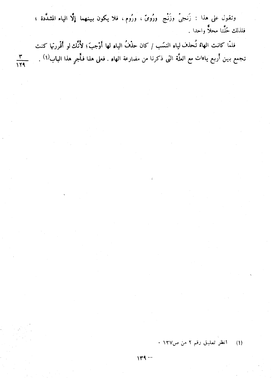 وَتقول على هَذَا: زنجى وزنج ورومى، وروم، فَلَا يكون بَينهمَا إِلَّا الْيَاء المشدد؛ فَلذَلِك حلتا محلا وَاحِدًا فَلَمَّا كَانَت الْهَاء تحذف لياء النّسَب / كَانَ حذف الْيَاء لَهَا وَاجِب؛ لِأَنَّك لَو أقررتها كنت تجمع بَين أَربع ياءات مَعَ الْعلَّة الَّتِى ذكرنَا من مضارعة الْهَاء فعلى هَذَا فأجر هَذَا الْبَاب