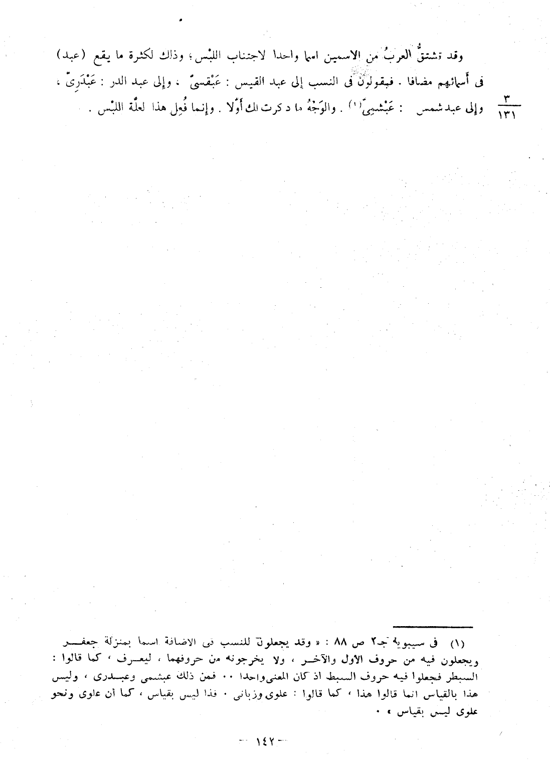 وَقد تشقق الْعَرَب من الاسمين اسْما وَاحِدًا لاجتناب اللّبْس؛ وَذَلِكَ لِكَثْرَة مَا يَقع (عبد) فى أسماهم مُضَافا فَيَقُولُونَ فى النّسَب إِلَى عبد الْقَيْس: عبقسى، وَإِلَى عبد الدّرّ: عبدرى، وَإِلَى عبد شمس: عبشمى وَالْوَجْه مَا ذكرت لَك أَولا وَإِنَّمَا فعل هَذَا لعِلَّة اللّبْس