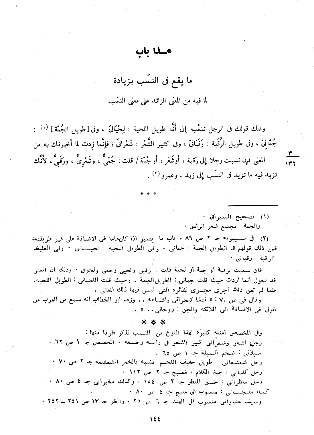 وَذَلِكَ قَوْلك فى الرجل تنسبه إِلَى أته طَوِيل اللِّحْيَة: لحيانى، وفى طَوِيل الجمة: جمانى، وفى طَوِيل الرَّقَبَة: رقبانى، وفى كثير الشّعْر: شعرانى؛ فَإِنَّمَا زِدْت لما أَخْبَرتك بِهِ من الْمَعْنى فَإِن نسبت رجلا إِلَى رَقَبَة، أَو شعر، أَو جمة / قلت: جمى، وشعرى، ورقبى، لِأَنَّك تزيد فِيهِ مَا تزيد فى النّسَب إِلَى زيد، وَعَمْرو
