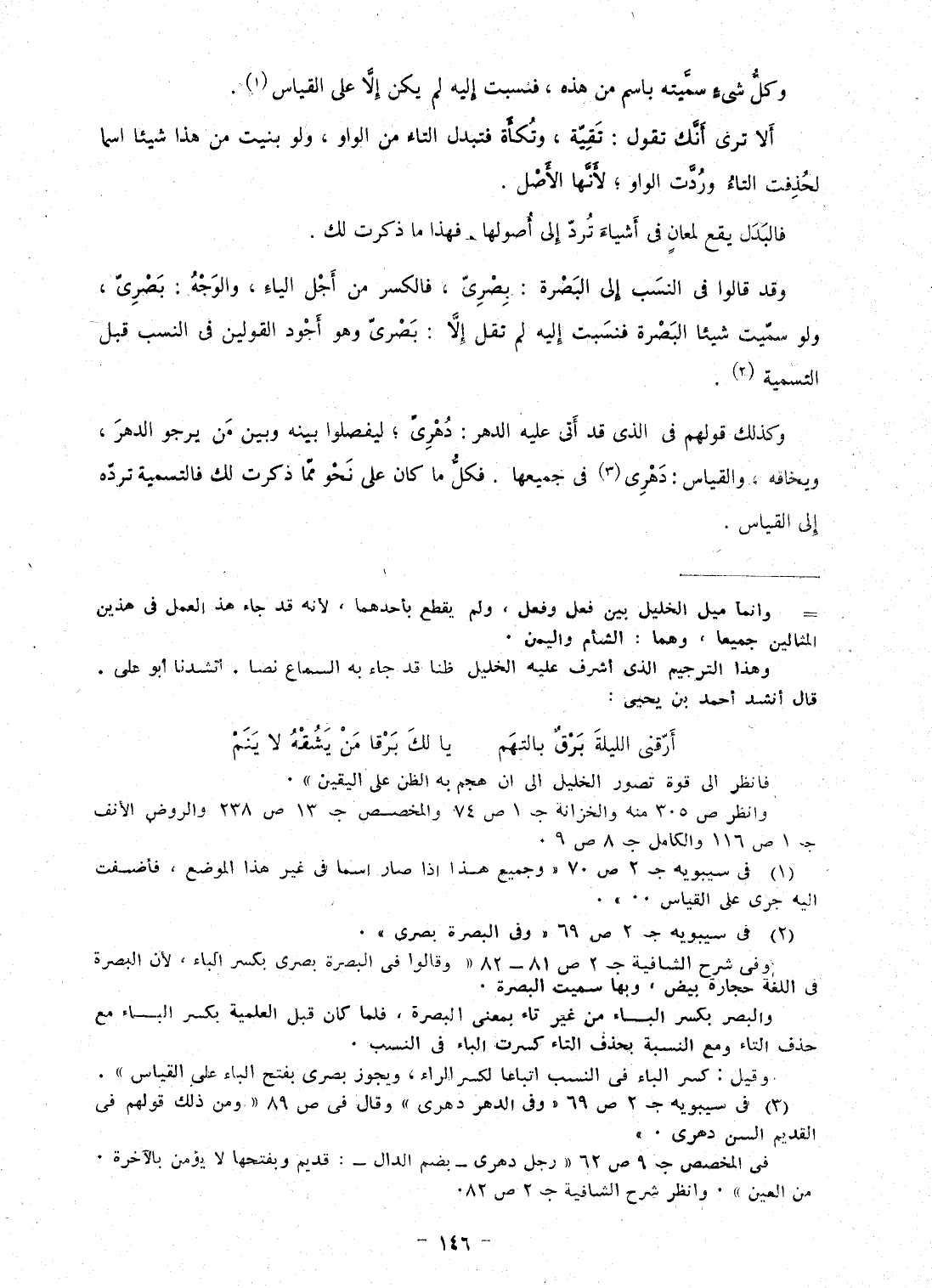 وكل شئ سميته باسم من هَذِه، فنسبت إِلَيْهِ لم يكن إِلَّا على الْقيَاس أَلا ترى أَنَّك تَقول: تقية، وتكأة فتبدل التَّاء من الْوَاو، وَلَو بنيت من هَذَا شَيْئا اسْما لحذفت التَّاء وَردت الْوَاو؛ لِأَنَّهَا الأَصْل فالبدل يَقع لمعان فى أَشْيَاء ترد إِلَى أُصُولهَا، فَهَذَا مَا ذكرت لَك وَقد قَالُوا فى النّسَب إِلَى الْبَصْرَة: بصرى، فالكسر من أجل الْيَاء، وَالْوَجْه: بصرى، وَلَو سميت شَيْئا الْبَصْرَة فنسبت إِلَيْهِ لم تقل إِلَّا: بصرى وَهُوَ أَجود الْقَوْلَيْنِ فى النّسَب قبل التَّسْمِيَة وَكَذَلِكَ قَوْلهم فى الذى قد أَتَى عَلَيْهِ الدَّهْر: دهرى؛ ليفصلوا بَينه وَبَين من يَرْجُو الدَّهْر، ويخافه، وَالْقِيَاس: دهرى فى جَمِيعهَا فَكل مَا كَانَ على نَحْو مِمَّا ذكرت لَك فالتسمية ترده إِلَى الْقيَاس