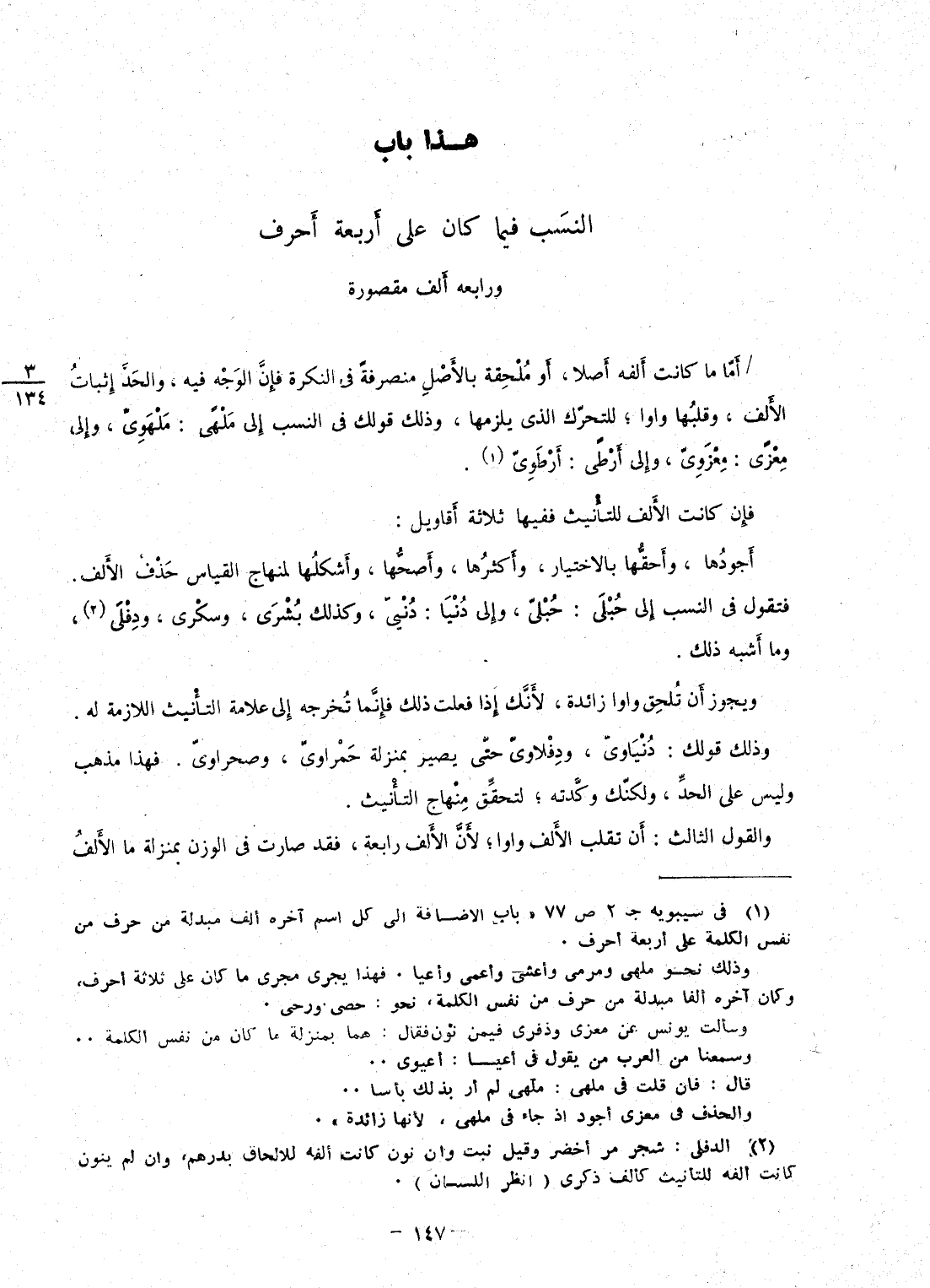 / أما مَا كَانَت أَلفه أصلا، أَو مُلْحقَة بِالْأَصْلِ منصرفة فى النكرَة فَإِن الْوَجْه فِيهِ، وَالْحَد إِثْبَات الْألف، وَقبلهَا واوا؛ للتحرك الذى يلْزمهَا، وَذَلِكَ قَوْلك فى النّسَب إِلَى ملهى: ملهوى، وَإِلَى معزى: معزوى، وَإِلَى أرطى: أرطوى فَإِن كَانَت الْألف للتأنيث فَفِيهَا ثَلَاثَة أقاويل: أَجودهَا، وأحقها بِالِاخْتِيَارِ، وأكثرها، وأصحها، وأشكلها لمنهاج الْقيَاس حذف الْألف فَتَقول فى النّسَب إِلَى حُبْلَى: حُبْلَى، وَإِلَى دنيا: دني، وَكَذَلِكَ بشرى، وسكرى، ودفلى، وَمَا أشبه ذَلِك وَيجوز أَن تلْحق واوا زَائِدَة، لِأَنَّك إِذا فعلت ذَلِك فَإِنَّمَا تخرجه إِلَى عَلامَة التَّأْنِيث اللَّازِمَة لَهُ وَذَلِكَ قَوْلك: دنياوى، ودفلاوى حَتَّى يصير بِمَنْزِلَة حمراوى، وصحراوى فَهَذَا مَذْهَب وَلَيْسَ على الْحَد، وَلَكِنَّك وكدته؛ لتحَقّق منهاج التَّأْنِيث وَالْقَوْل الثَّالِث: أَن تقلب الْألف واوا؛ لِأَن الْألف رَابِعَة، فقد صَارَت فى الْوَزْن بِمَنْزِلَة مَا الْألف