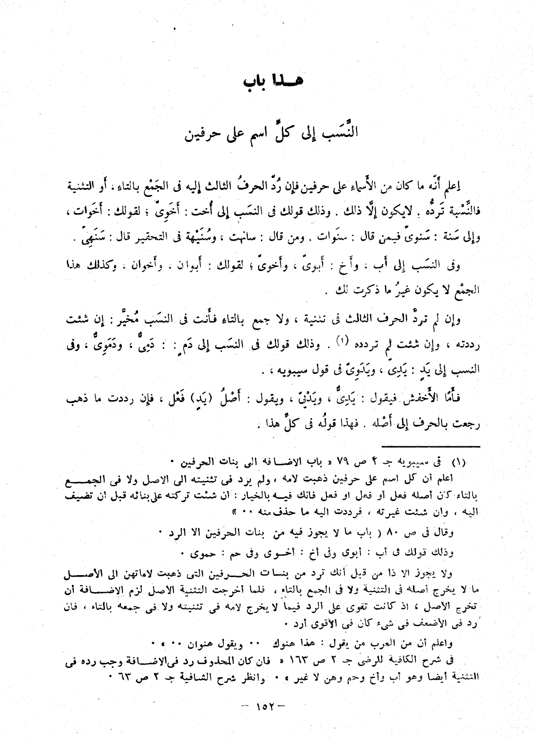 اعْلَم أَنه مَا كَانَ من الْأَسْمَاء على حرفين فَإِن رد الْحَرْف الثَّالِث إِلَيْهِ فى الْجمع بِالتَّاءِ، أَو التَّثْنِيَة فالنسبة ترده لَا يكون إِلَّا ذَلِك وَذَلِكَ قَوْلك فى النّسَب إِلَى أُخْت: أخوى؛ لِقَوْلِك: أَخَوَات، وَإِلَى سنة: سنوى فِيمَن قَالَ: سنوات، وَمن قَالَ: سانهت، وسنيهة فى التحقير قَالَ: سنهى وفى النّسَب إِلَى أَب، وَأَخ: أبوى، وأخوى؛ لِقَوْلِك: أَبَوَانِ، وَأَخَوَانِ، وَكَذَلِكَ هَذَا الْجمع لَا يكون غير مَا ذكرت لَك وَإِن لم ترد الْحَرْف الثَّالِث فِي تَثْنِيَة، وَلَا جمع بِالتَّاءِ فَأَنت فى النّسَب مُخَيّر: إِن شِئْت رَددته، وَإِن شت لم تردده وَذَلِكَ قَوْلك فى النّسَب إِلَى دم: دمى، ودموى، وفى النّسَب إِلَى يَد: يدى، ويدوى فى قَول سِيبَوَيْهٍ، فَأَما الْأَخْفَش فَيَقُول: يدى، ويديى، وَيَقُول: أصل (يَد) فعل، فَإِن رددت مَا ذهب رجعت بالحرف إِلَى أَصله فَهَذَا قَوْله فى كل هَذَا