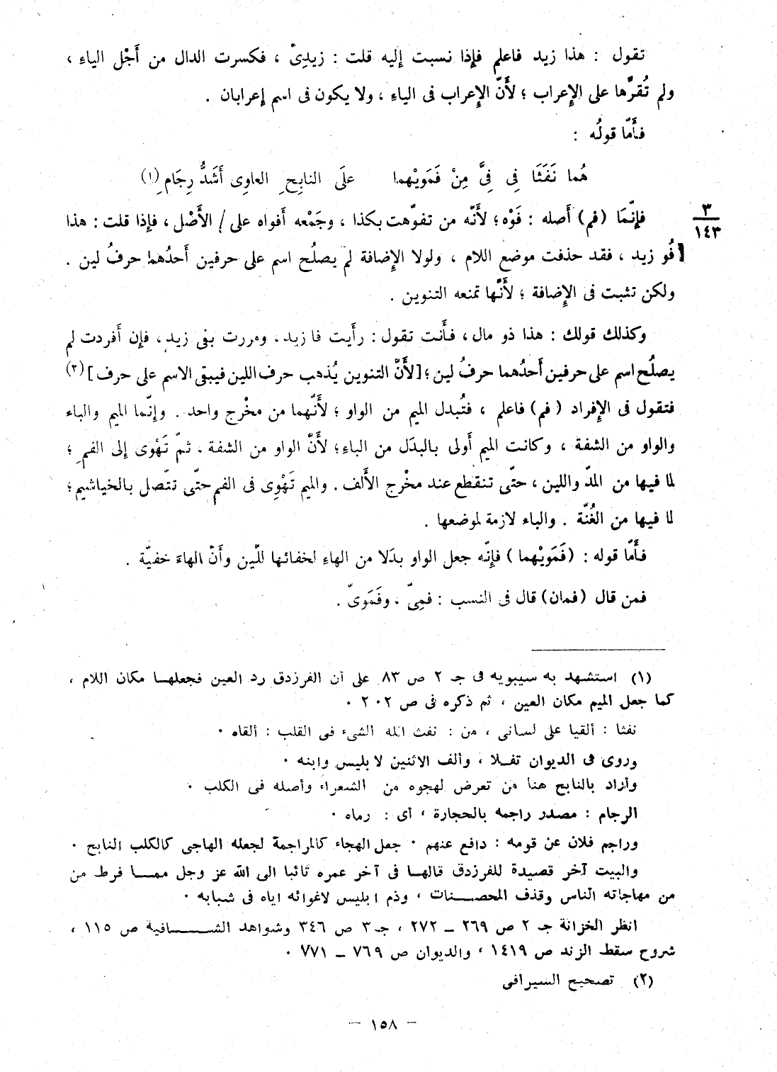 فَإِنَّمَا (فَم) أَصله: فوه؛ لِأَنَّهُ من تفوهت بِكَذَا، وَجمعه أَفْوَاه على / الأَصْل، فَإِذا قلت: هَذَا فو زيد، فقد حذفت مَوضِع اللَّام، وَلَوْلَا الْإِضَافَة لم يصلح اسْم على حرفين أَحدهمَا حرف لين وَلَكِن تثبت فى الْإِضَافَة؛ لِأَنَّهَا تَمنعهُ التَّنْوِين وَكَذَلِكَ قَوْلك: هَذَا ذُو مَال، فَأَنت تَقول: رَأَيْت فازيد، ومررت بفى زيد، فَإِن أفردت لم يصلح اسْم على حرفين أَحدهمَا حرف لين؛ [لِأَن التَّنْوِين يذهب حرف اللين فَيبقى الِاسْم على حرف] فَتَقول فى الْإِفْرَاد (فَم) فَاعْلَم، فتبدل الْمِيم من الْوَاو؛ لِأَنَّهُمَا من مخرج وَاحِد وَإِنَّمَا الْمِيم وَالْبَاء وَالْوَاو من الشّفة، وَكَانَت الْمِيم أولى بِالْبَدَلِ من الْبَاء؛ لِأَن الْوَاو من الشّفة، ثمَّ تهوى إِلَى الْفَم؛ لما فِيهَا من الْمَدّ واللين، حَتَّى تَنْقَطِع عِنْد مخرج الْألف وَالْمِيم تهوى فى الْفَم حَتَّى تتصل بالخياشيم؛ لما فِيهَا من الغنة وَالْبَاء لَازِمَة لموضعها فَأَما قَوْله: (فمويهما) فَإِنَّهُ جعل الْوَاو بَدَلا من الْهَاء لخفائها للين وَأَن الْهَاء خُفْيَة فَمن قَالَ (فمان) قَالَ فى النّسَب: فمى، وفموى