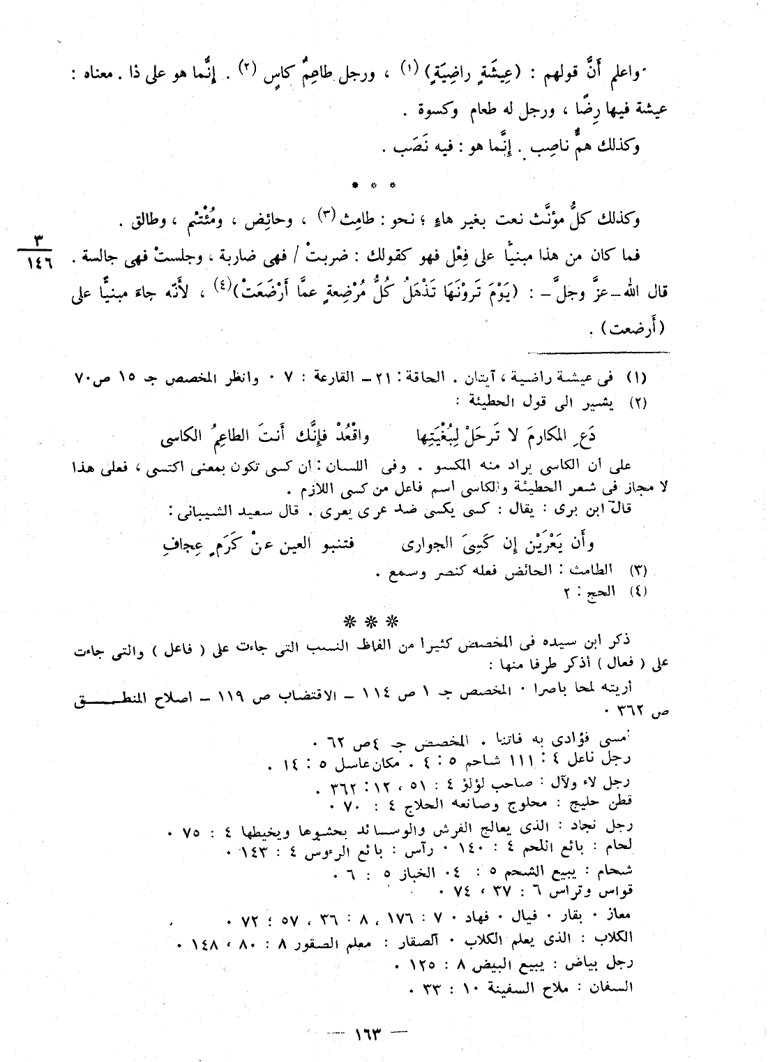 وَاعْلَم أَن قَوْلهم: (عيشة راضية) ، وَرجل طاعم كاس إِنَّمَا هُوَ على ذَا مَعْنَاهُ: عيشة فِيهَا رضَا، وَرجل لَهُ طَعَام وَكِسْوَة وَكَذَلِكَ هم ناصب إِنَّمَا هُوَ: فِيهِ نصب وَكَذَلِكَ كل مؤنث نعت بِغَيْر هَاء؛ نَحْو: طامث، وحائض، ومئتم، وَطَالِق فَمَا كَانَ من هَذَا مُبينًا على فعل فَهُوَ كَقَوْلِك: ضربت / فهى ضاربة، وَجَلَست فهى جالسة قَالَ الله - عز وَجل -: {يَوْم ترونها تذهل كل مُرْضِعَة عَمَّا أرضعت} ، لِأَنَّهُ جَاءَ مُبينًا على (أرضعت)
