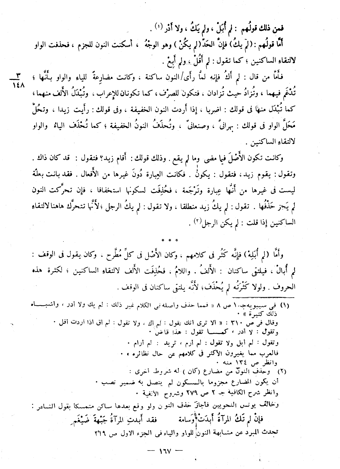 فَمن ذَلِك قَوْلهم: لم أبل، وَلم يَك، وَلَا أدر أما قَوْلهم: (لم يَك) فَإِن الْحَد (لم يكن) وَهُوَ الْوَجْه، أسكنت النُّون للجزم، فحذفت الْوَاو لالتقاء الساكنين؛ كَمَا تَقول: لم أقل، وَلم أبع فَأَما من قَالَ: لم أك فَإِنَّهُ لما رأى / النُّون سَاكِنة، وَكَانَت مضارعة للياء وَالْوَاو بِأَنَّهَا؛ تُدْغَم فيهمَا، وتزداد حَيْثُ تزدادان، فَتكون للصرف، كَمَا تَكُونَانِ للإعراب، وتبدل الْألف مِنْهُمَا، كَمَا تبدل مِنْهَا فى قَوْلك: اضربا، إِذا أردْت النُّون الْخَفِيفَة، وفى قَوْلك: رَأَيْت زيدا، وَتحل مَحل الْوَاو فى قَوْلك: بهرانى، وصنعانى، وتحذف النُّون الْخَفِيفَة؛ كَمَا تحذف الْيَاء وَالْوَاو لالتقاء الساكنين وَكَانَت تكون الأَصْل فِيمَا مضى وَمَا لم يَقع وَذَلِكَ قَوْلك: أَقَامَ زيد؟ فَتَقول: قد كَانَ ذَاك وَتقول: يقوم زيد، فَتَقول: يكون فَكَانَت الْعبارَة دون غَيرهَا من الْأَفْعَال فقد بَانَتْ بعلة لَيست فى غَيرهَا من أَنَّهَا عبارَة وترجمة، فحذفت لسكونها اسْتِخْفَافًا، فَإِن تحركت النُّون لم يجز حذفهَا تَقول: لم يَك زيد مُنْطَلقًا، وَلَا تَقول: لم يَك الرجل؛ لِأَنَّهَا تتحرك هَاهُنَا لالتقاء الساكنين إِذا قلت: لم يكن الرجل وَأما (لم أبله) فَإِنَّهُ كثر فى كَلَامهم، وَكَانَ الأَصْل فى كل مطرح، وَكَانَ يَقُول فى الْوَقْف: لم أبال، فيلتقى ساكنان: الْألف، وَاللَّام، فحذفت الْألف لالتقاء الساكنين؛ لِكَثْرَة هَذِه الْحُرُوف وَلَوْلَا كثرته لم يحذف؛ لِأَنَّهُ يلتقى ساكنان فى الْوَقْف