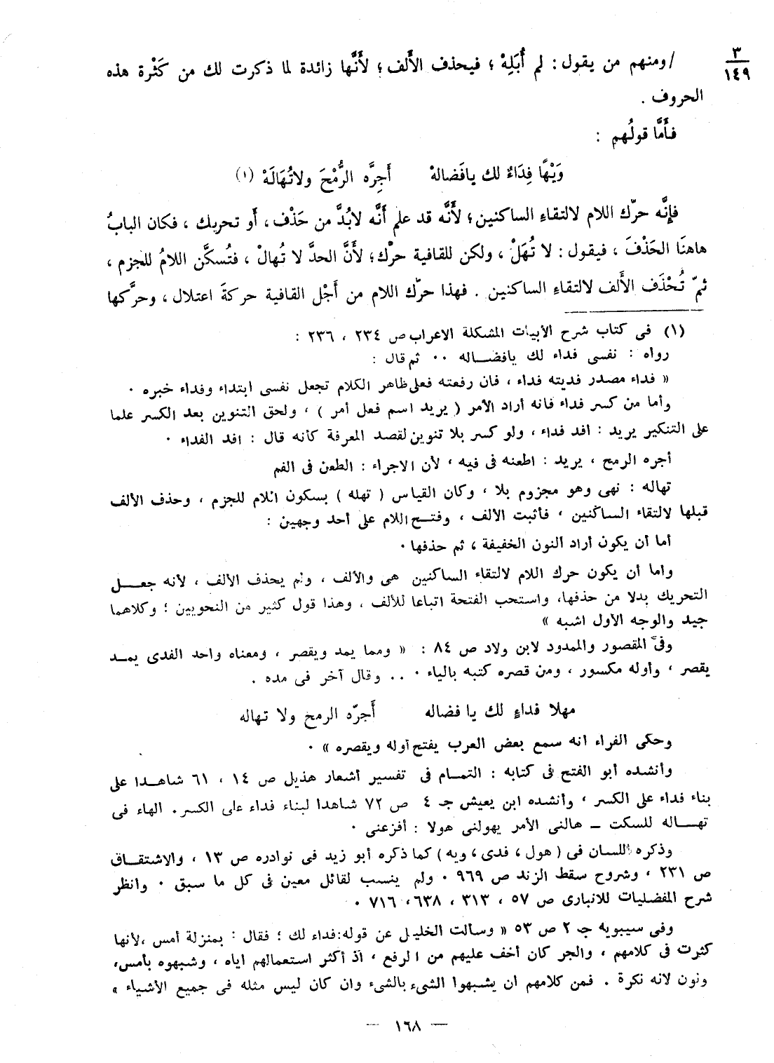 فَإِنَّهُ حرك اللَّام لالتقاء الساكنين؛ لِأَنَّهُ قد علم أَنه لابد من حذف، أَو تَحْرِيك، فَكَانَ الْبَاب هَاهُنَا الْحَذف، فَيَقُول: لَا تهل، وَلَكِن للقافية حرك؛ لِأَن الْحَد لَا تهال، فتسكن اللَّام للجزم، ثمَّ تحذف الْألف لالتقاء الساكنين فَهَذَا حرك اللَّام من أجل القافية حَرَكَة اعتلال، وحركها