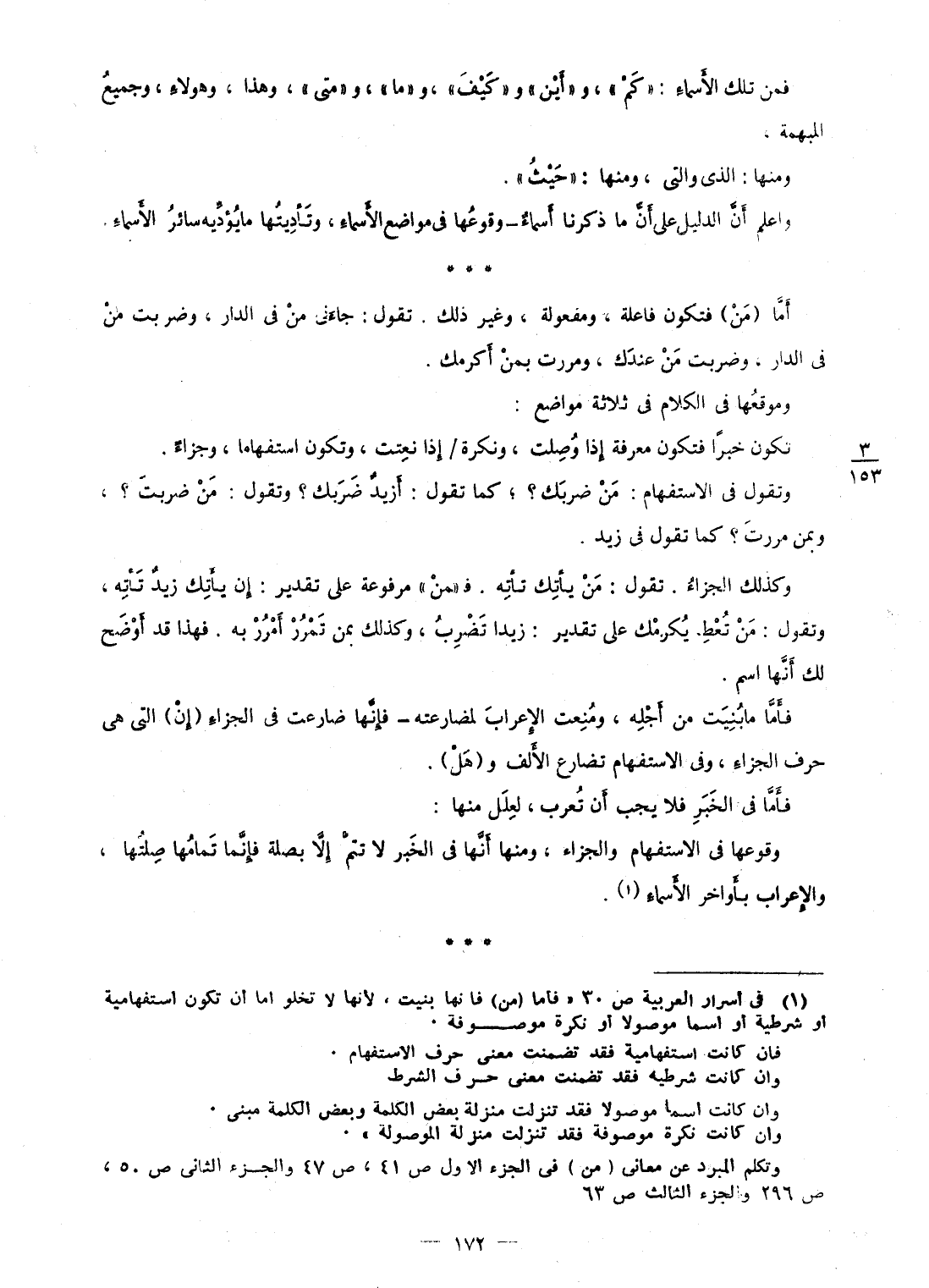 فَمن تِلْكَ الْأَسْمَاء: " كم "، و " أَيْن " و " كَيفَ "، و " مَا "، و " مَتى "، وَهَذَا، وَهَؤُلَاء، وَجَمِيع المبهمة وَمِنْهَا: الذى والتى، وَمِنْهَا: " حَيْثُ " وَاعْلَم أَن الدَّلِيل على أَن مَا ذكرنَا أَسمَاء - وُقُوعهَا فى مَوَاضِع الْأَسْمَاء، وتأديتها مَا يُؤَدِّيه سَائِر الْأَسْمَاء أما (من) فَتكون فاعلة، ومفعولة، وَغير ذَلِك تَقول: جاءنى من فى الدَّار، وَضربت من فى الدَّار، وَضربت من عنْدك، ومررت بِمن أكرمك وموقعها فى الْكَلَام فى ثَلَاثَة مَوَاضِع: تكون خَبرا فَتكون معرفَة إِذا وصلت، ونكرة / إِذا نعتت، وَتَكون استفهاما، وَجَزَاء وَتقول فى الِاسْتِفْهَام: من ضربك؟ ؛ كَمَا تَقول: أَزِيد ضربك؟ وَتقول: من ضربت؟ ، وبمن مَرَرْت؟ كَمَا تَقول فى زيد وَكَذَلِكَ الْجَزَاء تَقول: من يأتك تأته ف " من " مَرْفُوعَة على تَقْدِير: إِن يأتك زيد تأته، وَتقول: من تعط يكرمك على تَقْدِير: زيدا تضرب، وَكَذَلِكَ بِمن تمرر أمرر بِهِ فَهَذَا قد أوضح لَك أَنَّهَا اسْم فَأَما مَا بنيت من أَجله، ومنعت الْإِعْرَاب لمضارعته - فَإِنَّهَا ضارعت فى الْجَزَاء (إِن) الَّتِى هى حرف الْجَزَاء، وفى الِاسْتِفْهَام تضارع الْألف و (هَل) فَأَما فى الْخَبَر فَلَا يجب أَن تعرب، لعلل مِنْهَا: وُقُوعهَا فى الِاسْتِفْهَام وَالْجَزَاء، وَمِنْهَا أَنَّهَا فى الْخَبَر لَا تتمّ إِلَّا بصلَة فَإِنَّمَا تَمامهَا صلتها، وَالْإِعْرَاب بأواخر الْأَسْمَاء