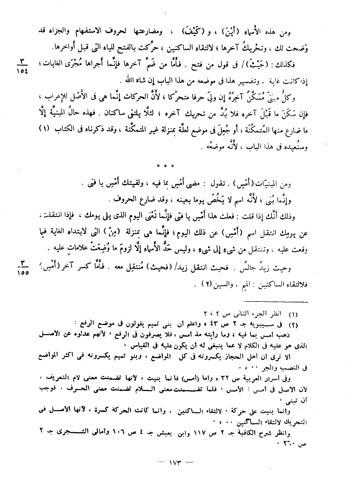 وَمن هَذِه الْأَسْمَاء (أَيْن) ، و (كَيفَ) ، ومضارعتها لحروف الِاسْتِفْهَام وَالْجَزَاء قد وضحت لَك، وتحريك آخرهَا لالتقاء الساكنين، حركت بِالْفَتْح للياء الَّتِى قبل أواخرها فَكَذَلِك: (حَيْثُ) / فى قَول من فتح فَأَما من ضم آخرهَا فَإِنَّمَا أجراها مجْرى الغايات؛ إِذْ كَانَت غَايَة، وَتَفْسِير هَذَا فى مَوْضِعه من هَذَا الْبَاب إِن شَاءَ الله وكل مبْنى مسكن آخِره إِن ولى حرفا متحركا؛ لِأَن الحركات إِنَّمَا هى فى الأَصْل للإعراب، فَإِن سكن مَا قبل آخِره فَلَا بُد من تَحْرِيك آخِره؛ لِئَلَّا يلتقى ساكنان فَهَذِهِ حَال المبينة إِلَّا مَا ضارع مِنْهَا المتمكنة، أَو جعل فى مَوضِع لعِلَّة بِمَنْزِلَة غير المتمكنة، وَقد ذَكرْنَاهُ فى الْكتاب وسنعيده فى هَذَا الْبَاب، لِأَنَّهُ مَوْضِعه وَمن المبينات (أمس) تَقول: مضى أمس بِمَا فِيهِ، ولقيتك أمس يَا فَتى وَإِنَّمَا بنى؛ لِأَنَّهُ اسْم لَا يخص يَوْمًا بِعَيْنِه، وَقد ضارع الْحُرُوف وَذَلِكَ أَنَّك إِذا قلت: فعلت هَذَا أمس يَا فَتى فَإِنَّمَا تعنى الْيَوْم الذى يلى يَوْمك، فَإِذا انْتَقَلت، عَن يَوْمك انْتقل اسْم (أمس) عَن ذَلِك الْيَوْم؛ فَإِنَّمَا هى بِمَنْزِلَة (من) الَّتِى لابتداء الْغَايَة فِيمَا وَقعت عَلَيْهِ، وتنتقل من شئ إِلَى شئ، وَلَيْسَ حد الْأَسْمَاء إِلَّا لُزُوم مَا وضعت عَلَامَات عَلَيْهِ وَحَيْثُ زيد جَالس فَحَيْثُ انْتقل زيد / (فَحَيْثُ) منتقل مَعَه فَأَما كسر آخر (أمس) فلالتقاء الساكنين: الْمِيم، وَالسِّين