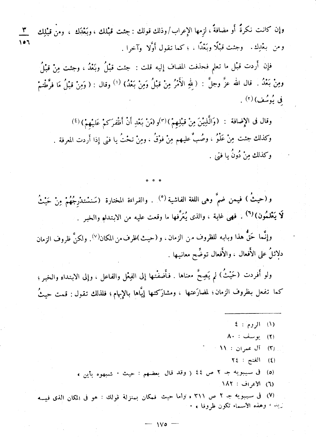 وَإِن كَانَت نكرَة أَو مُضَافَة، لَزِمَهَا الْإِعْرَاب / وَذَلِكَ قَوْلك: جِئْت قبلك، بعْدك، وَمن قبلك وَمن بعْدك، وَجئْت قبلا وبعدا؛ كَمَا تَقول أَولا وآخرا فَإِن أردْت قبل مَا تعلم فحذفت الْمُضَاف إِلَيْهِ قلت: جِئْت قبل وَبعد، وَجئْت من قبل وَمن بعد قَالَ الله عز وَجل: {لله الْأَمر من قبل وَمن بعد} وَقَالَ: {وَمن قبل مَا فرطتم فِي يُوسُف} وَقَالَ فى الْإِضَافَة: {وَالَّذين من قبلهم} و {من بعد أَن أَظْفَرَكُم عَلَيْهِم} وَكَذَلِكَ جِئْت من علو، وصب عَلَيْهِم من فَوق، وَمن تَحت يَا فَتى إِذا أردْت الْمعرفَة وَكَذَلِكَ من دون يَا فَتى و (حَيْثُ) فِيمَن ضم وهى اللُّغَة الفاشية وَالْقِرَاءَة المختارة (سنتدرجهم من حَيْثُ لَا يعلمُونَ) فهى غَايَة، والذى يعرفهَا مَا وَقعت عَلَيْهِ من الِابْتِدَاء وَالْخَبَر وَإِنَّمَا حق هَذَا وبابه للظروف من الزَّمَان، و (حَيْثُ) ظرف من الْمَكَان وَلَكِن ظروف الزَّمَان دَلَائِل على الْأَفْعَال، وَالْأَفْعَال توضح مَعَانِيهَا وَلَو أفردت (حَيْثُ) لم يَصح مَعْنَاهَا فأضفتها إِلَى الْفِعْل وَالْفَاعِل، وَإِلَى الِابْتِدَاء وَالْخَبَر؛ كَمَا تفعل بظروف الزَّمَان؛ لمضارعتها، ومشاركتها إِيَّاهَا بالإبهام؛ فَلذَلِك تَقول: قُمْت حَيْثُ