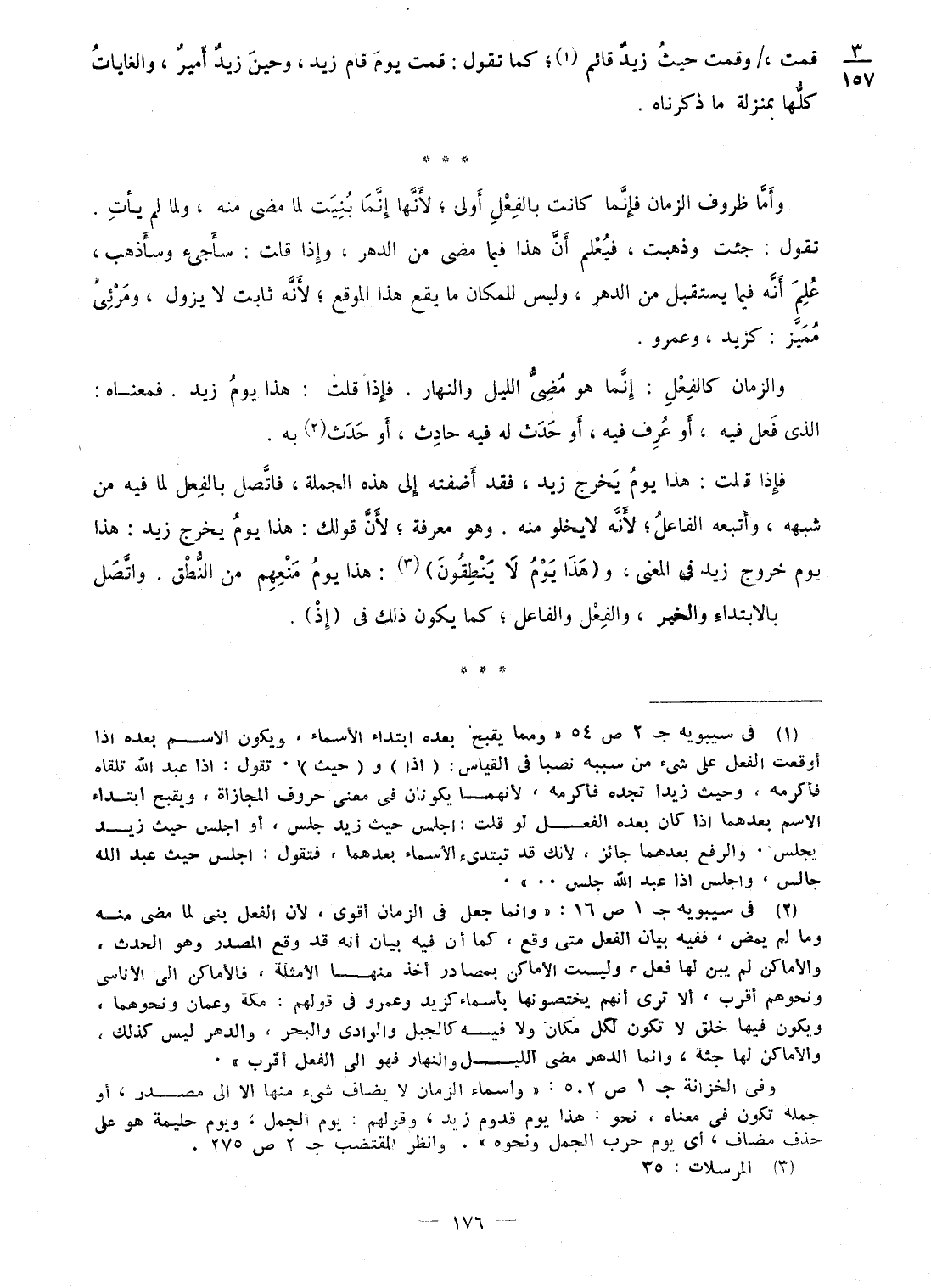 قُمْت، / وَقمت حَيْثُ زيد قَائِم؛ كَمَا تَقول: قُمْت يَوْم قَامَ زيد، وَحين زيد أَمِير، والغايات كلهَا بِمَنْزِلَة مَا ذَكرْنَاهُ وَأما ظروف الزَّمَان فَإِنَّمَا كَانَت بِالْفِعْلِ أولى؛ لِأَنَّهَا إِنَّمَا بنيت لما مضى مِنْهُ، وَلما لم يَأْتِ تَقول: جِئْت وَذَهَبت، فَيعلم أَن هَذَا فِيمَا مضى من الدَّهْر، وَإِذا قلت: سأجئ وسأذهب، علم أَنه فِيمَا يسْتَقْبل من الدَّهْر، وَلَيْسَ للمكان مَا يَقع هَذَا الْموقع؛ لِأَنَّهُ ثَابت لَا يَزُول، ومرئى مُمَيّز: كزيد، وَعَمْرو وَالزَّمَان كالفعل: إِنَّمَا هُوَ مضى اللَّيْل وَالنَّهَار فَإِذا قلت: هَذَا يَوْم زيد فَمَعْنَاه: الذى فعل فِيهِ، أَو عرف فِيهِ، أَو حدث لَهُ فِيهِ حَادث، أَو حدث بِهِ فَإِذا قلت: هَذَا يَوْم يخرج زيد، فقد أضفته إِلَى هَذِه الْجُمْلَة، فاتصل بِالْفِعْلِ لما فِيهِ من شبهه، وَأتبعهُ الْفَاعِل؛ لِأَنَّهُ لَا يَخْلُو مِنْهُ وَهُوَ معرف؛ لِأَن قَوْلك: هَذَا يَوْم يخرج زيد: هَذَا يَوْم خُرُوج زيد فى الْمَعْنى، و {هَذَا يَوْم لَا ينطقون} : هَذَا يَوْم مَنعهم من النُّطْق واتصل بِالِابْتِدَاءِ وَالْخَيْر، وَالْفِعْل وَالْفَاعِل؛ كَمَا يكون ذَلِك فى (إِذْ)