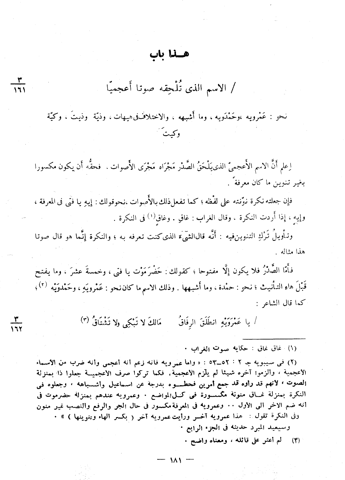 نَحْو: عمرويه، وحمدويه، وَمَا أشبهه، وَالِاخْتِلَاف فى هَيْهَات، ذية وذيت، وكية وَكَيْت وَاعْلَم أَن الِاسْم الأعجمي الذى يلْحق الصَّدْر مجْرَاه مجْرى الْأَصْوَات، فحقه أَن يكون مكسورا بِغَيْر تَنْوِين مَا كَانَ معرفَة فَإِن جعلته نكرَة نونته على لَفظه؛ كَمَا تفعل ذَلِك بالأصوات، نَحْو قَوْلك: إيه يَا فَتى فى الْمعرفَة، وإيه، إِذا أردْت النكرَة، وَقَالَ الْغُرَاب: غاق وغاق فى النكرَة وَتَأْويل ترك التَّنْوِين فِيهِ: أَنه قَالَ الشئ الذى كنت تعرفه بِهِ؛ والنكرة إِنَّمَا هُوَ قَالَ صَوتا هَذَا مِثَاله فَأَما الصَّدْر فَلَا يكون إِلَّا مَفْتُوحًا؛ كَقَوْلِك: حَضرمَوْت يَا فَتى، وَخَمْسَة عشر، وَمَا يفتح قبل هَاء التَّأْنِيث؛ نَحْو: حمدة، وَمَا أشبههَا وَذَلِكَ الِاسْم مَا كَانَ نَحْو: عمرويه، وحمدويه؛ كَمَا قَالَ الشَّاعِر: