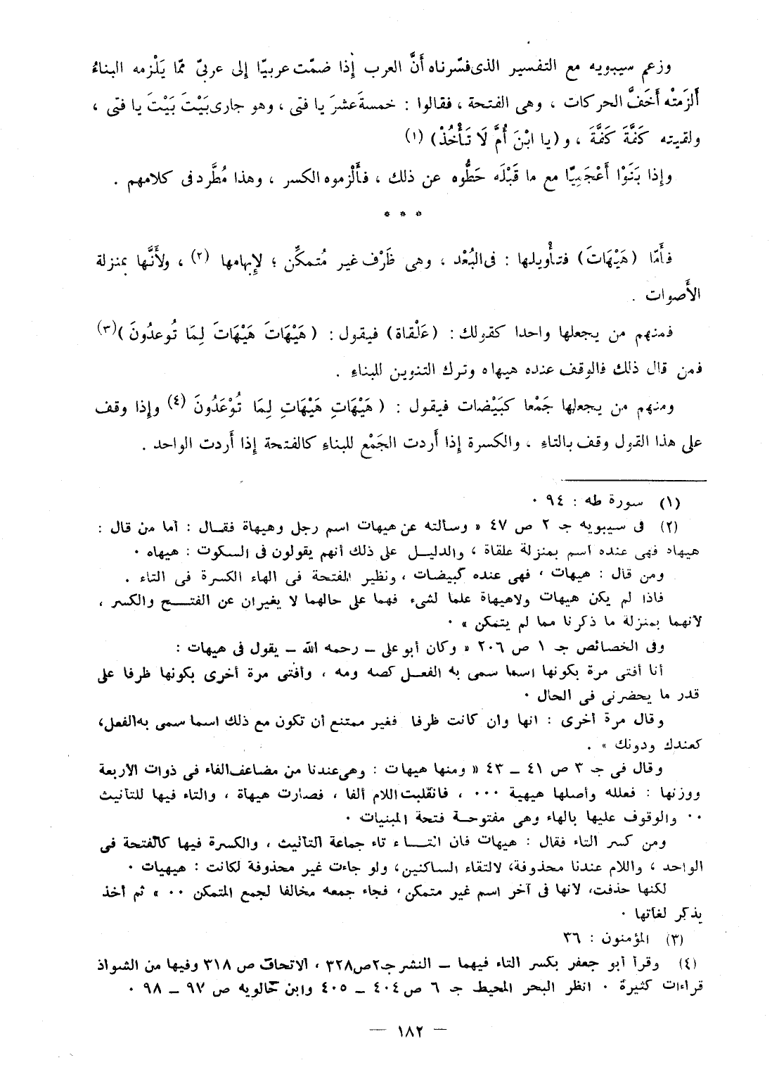 وَزعم سِيبَوَيْهٍ مَعَ التَّفْسِير الذى فسرناه أَن الْعَرَب إِذا ضمت عَرَبيا إِلَى عَرَبِيّ مِمَّا يلْزمه الْبناء ألزمته أخف الحركات، وهى الفتحة، فَقَالُوا: خَمْسَة عشر يَا فَتى، وَهُوَ جارى بَيت بَيت يَا فَتى، ولقيته كفة كفة، و (يَا ابْن أم لَا تَأْخُذ) وَإِذا بنوا أعجميا مَعَ مَا قبله حطوه عَن ذَلِك، فألزموه الْكسر، وَهَذَا مطرد فى كَلَامهم فَأَما (هَيْهَات) فتأويلها: فى الْبعد، وهى ظرف غير مُتَمَكن؛ لإبهامها، وَلِأَنَّهَا بمنزل الْأَصْوَات فَمنهمْ من يَجْعَلهَا وَاحِدًا كَقَوْلِك: (علقاة) فَيَقُول: (هَيْهَات هَيْهَات لما توعدون) فَمن قَالَ ذَلِك فالوقف عِنْده هيهاه وَترك التَّنْوِين للْبِنَاء وَمِنْهُم من يَجْعَلهَا جمعا كبيضات فَيَقُول: (هَيْهَات هَيْهَات لما توعدون وَإِذا وقف على هَذَا القَوْل وقف بِالتَّاءِ، والكسرة إِذا أردْت الْجمع للْبِنَاء كالفتحة إِذا أردْت الْوَاحِد
