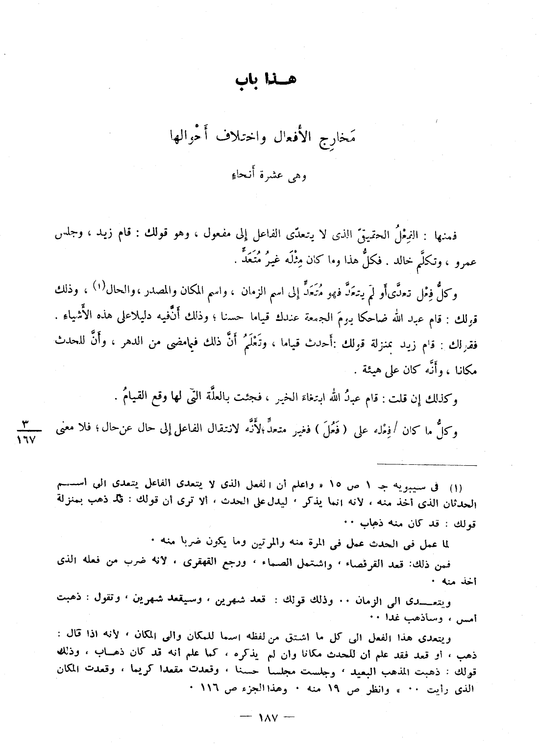 فَمِنْهَا: الْفِعْل الحقيقى الذى لَا يتَعَدَّى الْفَاعِل إِلَى مفعول، وَهُوَ قَوْلك: قَامَ زيد، وَجلسَ عَمْرو، وَتكلم خَالِد فَكل هَذَا وَمَا كَانَ مثله غير مُتَعَدٍّ وكل فعل تعدى أَو لم يَتَعَدَّ فَهُوَ مُتَعَدٍّ إِلَى اسْم الزَّمَان، وَاسم الْمَكَان والمصدر، وَالْحَال، وَذَلِكَ قَوْلك: قَامَ عبد الله ضَاحِكا يَوْم الْجُمُعَة عنْدك قيَاما حسنا؛ وَذَلِكَ أَن فِيهِ دَلِيلا على هَذِه الْأَشْيَاء فقولك: قَامَ زيد بِمَنْزِلَة قَوْلك: أحدث قيَاما، وَتعلم أَن ذَلِك فِيمَا مضى من الدَّهْر، وَأَن للْحَدَث مَكَانا، وَأَنه كَانَ على هَيْئَة وَكَذَلِكَ إِن قلت: قَامَ عبد الله ابْتِغَاء الْخَيْر، فَجئْت بِالْعِلَّةِ الَّتِى لَهَا وَقع الْقيام وكل مَا كَانَ / فعله على (فعل) فَغير مُتَعَدٍّ؛ لِأَنَّهُ لانتقال الْفَاعِل إِلَى حَال عَن حَال؛ فَلَا معنى