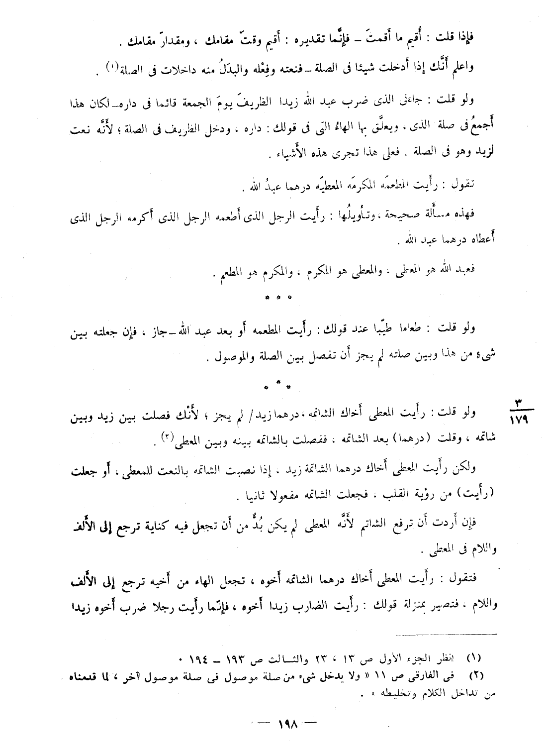 فَإِذا قلت: أقيم مَا أَقمت - فَإِنَّمَا تَقْدِيره: أقيم وَقت مقامك، وَمِقْدَار مقامك وَاعْلَم أَنَّك إِذا أدخلت شَيْئا فى الصِّلَة - فنعته وَفعله وَالْبدل مِنْهُ داخلات فى الصِّلَة وَلَو قلت: جاءنى الذى ضرب عبد الله زيدا الظريف يَوْم الْجُمُعَة قَائِما فى دَاره - لَكَانَ هَذَا أجمع فى صلَة الذى، ويعلق بهَا الْهَاء الَّتِى فى قَوْلك: دَاره، وَدخل الظريف فى الصِّلَة؛ لِأَنَّهُ نعت لزيد وَهُوَ فى الصِّلَة فعلى هَذَا تجرى هَذِه الْأَشْيَاء تَقول: رَأَيْت المطعمه المكرمه المعطيه درهما عبد الله فَهَذِهِ مَسْأَلَة صَحِيحَة، وتأويلها: رَأَيْت الرجل الذى أطْعمهُ الرجل الذى أكْرمه الرجل الذى أعطَاهُ درهما عبد الله فعبد الله هُوَ الْمُعْطى، والمعطى هُوَ المكرم، والمكرم هُوَ الْمطعم وَلَو قلت: طَعَاما طيبا عِنْد قَوْلك: رَأَيْت المطعمه أَو بعد عبد الله - جَازَ، فَإِن جعلته بَين شئ من هَذَا وَبَين صلته لم يجز أَن تفصل بَين الصِّلَة والموصول وَلَو قلت: رَأَيْت الْمُعْطى أَخَاك الشاتمه، درهما زيد / لم يجز؛ لِأَنَّك فصلت بَين زيد وَبَين شاتمه، وَقلت (درهما) بعد الشاتمه، ففصلت بالشاتمه بَينه وَبَين الْمُعْطى وَلَكِن رَأَيْت الْمُعْطى أَخَاك درهما الشاتمه زيد، إِذا نصبت الشاتمه بالنعت للمعطى، أَو جعلت (رَأَيْت) من رُؤْيَة الْقلب، فَجعلت الشاتمه مَفْعُولا ثَانِيًا فَإِن أردْت أَن ترفع الشاتم لِأَنَّهُ الْمُعْطى لم يكن بُد من أَن تجْعَل فِيهِ كِنَايَة ترجع إِلَى الْألف وَاللَّام فى الْمُعْطى فَتَقول: رَأَيْت الْمُعْطى أَخَاك درهما الشاتمه أَخُوهُ، تجْعَل الْهَاء من أَخِيه ترجع إِلَى الْألف وَاللَّام، فَتَصِير بِمَنْزِلَة قَوْلك: رَأَيْت الضَّارِب زيدا أَخُوهُ، فَإِنَّمَا رَأَيْت رجلا ضرب أَخُوهُ زيدا