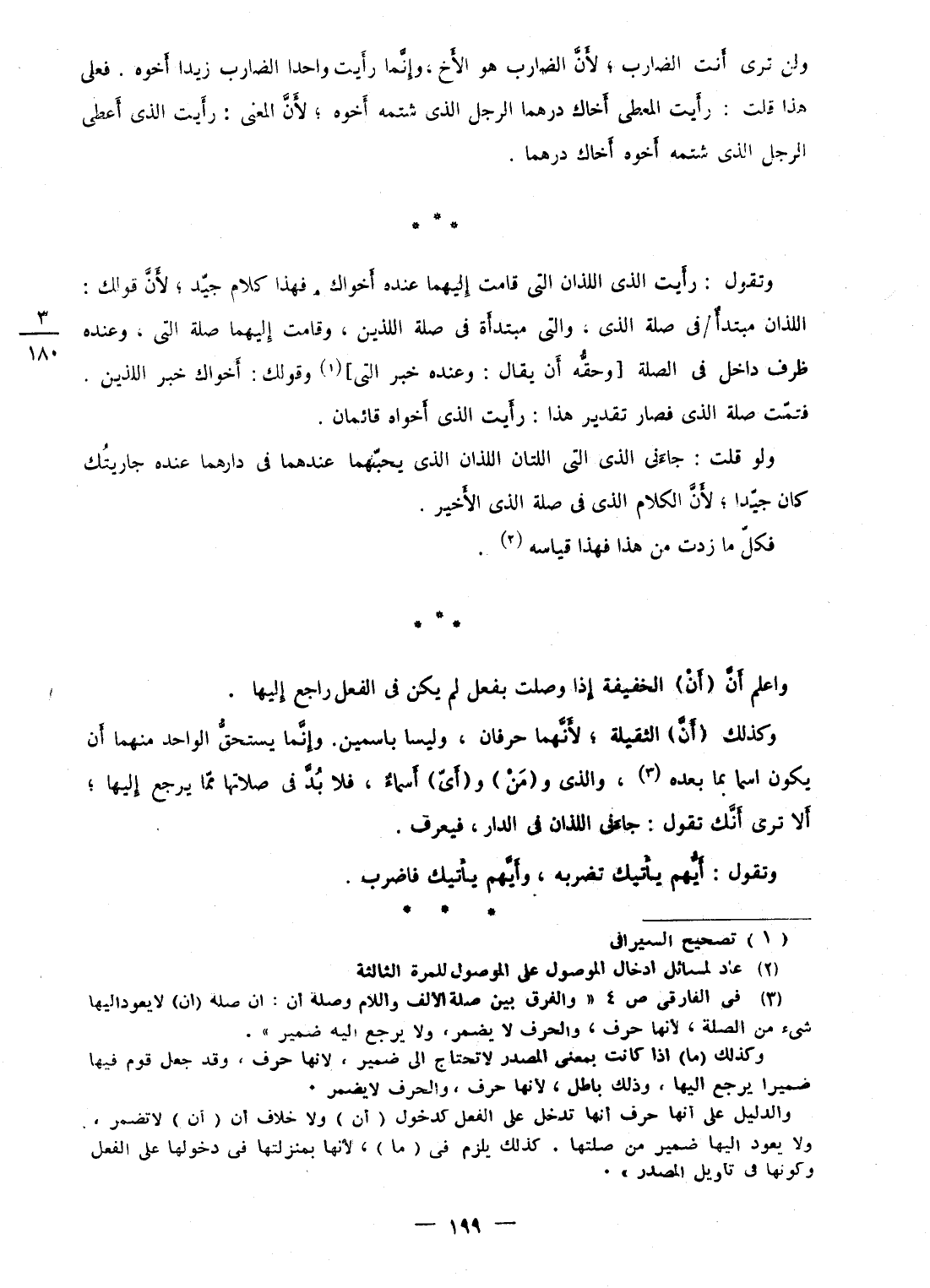 وَلنْ ترى أَنْت الضَّارِب؛ لِأَن الضَّارِب هُوَ الْأَخ، وَإِنَّمَا رَأَيْت وَاحِدًا الضَّارِب زيدا أَخُوهُ فعلى هَذَا قلت: رَأَيْت الْمُعْطى أَخَاك درهما الرجل الذى شَتمه أَخُوهُ؛ لِأَن الْمَعْنى: رَأَيْت الذى أعْطى الرجل الذى شَتمه أَخُوهُ أَخَاك درهما وَتقول: رَأَيْت الذى اللَّذَان الَّتِى قَامَت إِلَيْهِمَا عِنْده أَخَوَاك، فَهَذَا كَلَام جيد؛ لِأَن قَوْلك: اللَّذَان مُبْتَدأ / فى صلَة الذى، والتى مُبتَدأَة فى صلَة اللَّذين، وَقَامَت إِلَيْهِمَا صلَة الَّتِى، وَعِنْده ظرف دَاخل فى الصِّلَة [وَحقه أَن يُقَال: وَعِنْده خبر الَّتِى] وقولك: أَخَوَاك خبر اللَّذين فتمت صلَة الذى فَصَارَ تَقْدِير هَذَا: رَأَيْت الذى أَخَوَاهُ قائمان وَلَو قلت: جاءنى الذى الَّتِى اللَّتَان اللَّذَان الذى يحبهما عِنْدهمَا فى دارهما عِنْده جاريتك كَانَ جيدا؛ لِأَن الْكَلَام الذى فى صلَة الذى الْأَخير فَكل مَا زِدْت من هَذَا فَهَذَا قِيَاسه وَاعْلَم أَن (أَن) الْخَفِيفَة إِذا وصلت بِفعل لم يكن فى الْفِعْل رَاجع إِلَيْهَا وَكَذَلِكَ (أَن) الثَّقِيلَة؛ لِأَنَّهُمَا حرفان، وليسا باسمين وَإِنَّمَا يسْتَحق الْوَاحِد مِنْهُمَا أَن يكون اسْما بِمَا بعده، والذى و (من) و (أى) أَسمَاء، فَلَا بُد فى صلَاتهَا مِمَّا يرجع إِلَيْهَا؛ أَلا ترى أَنَّك تَقول: جاءنى اللَّذَان فى الدَّار، فَيعرف وَتقول: أَيهمْ يَأْتِيك تضربه، وأيهم يَأْتِيك فَاضْرب