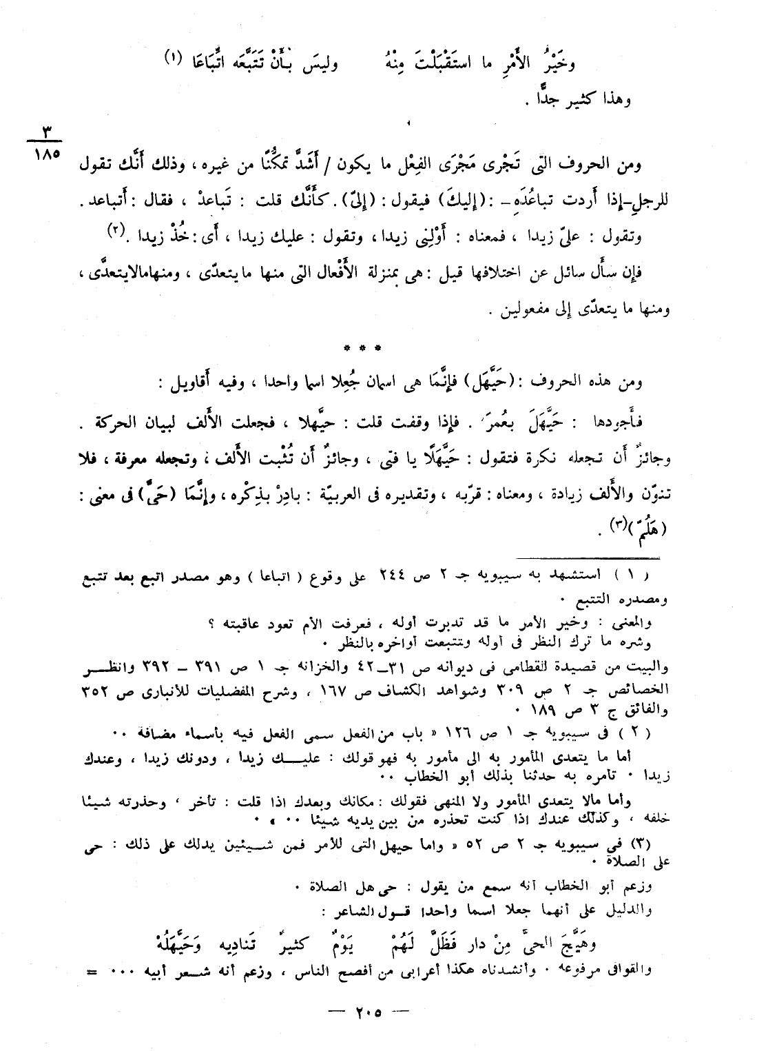 وَهَذَا كثير جدا وَمن الْحُرُوف الَّتِى تجرى مجْرى الْفِعْل مَا يكون / أَشد تمَكنا من غَيره، وَذَلِكَ أَنَّك تَقول للرجل - إِذا أردْت تباعده -: (إِلَيْك) فَيَقُول: (إِلَى) كَأَنَّك قلت: تبَاعد، فَقَالَ: أتباعد وَتقول: على زيدا، فَمَعْنَاه: أولنى زيدا، وَتقول: عَلَيْك زيدا، أى: خُذ زيدا فَإِن سَأَلَ سَائل عَن اختلافها قيل: هى بِمَنْزِلَة الْأَفْعَال الَّتِى مِنْهَا مَا يتَعَدَّى، وَمِنْهَا مَالا يتَعَدَّى، وَمِنْهَا مَا يتَعَدَّى إِلَى مفعولين وَمن هَذِه الْحُرُوف: (حيهل) فَإِنَّمَا هى اسمان جعلا اسْما وَاحِدًا، وَفِيه أقاويل: فأجودها: حيهل بعمر فَإِذا وقفت قلت: حيهلا فَجعلت الْألف لبَيَان الْحَرَكَة وَجَائِز أَن تَجْعَلهُ نكرَة فَتَقول حيهلا يَا فَتى، وَجَائِز أَن تثبت الْألف، وتجعله معرفَة، فَلَا تنون وَالْألف زِيَادَة، وَمَعْنَاهُ: قربه، وَتَقْدِيره فى العربيه: بَادر بِذكرِهِ، وَإِنَّمَا (حى) فى معنى: (هَلُمَّ)