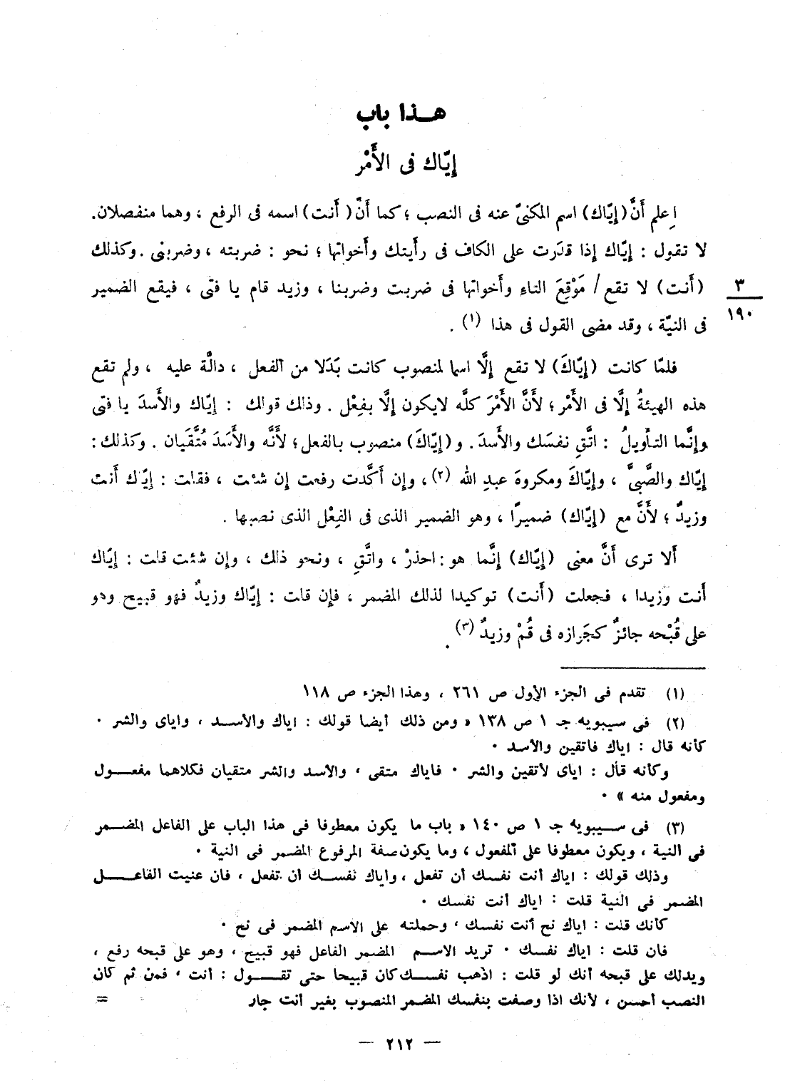 اعْلَم أَن (إياك) اسْم المكنى عَنهُ فى النصب؛ كَمَا أَن (أَنْت) اسْمه فى الرّفْع، وهما منفصلان، لَا تَقول: إياك إِذا قدرت على الْكَاف فى رَأَيْتُك وَأَخَوَاتهَا؛ نَحْو: ضَربته، وضربنى وَكَذَلِكَ (أَنْت) لَا تقع / موقع التَّاء وَأَخَوَاتهَا فى ضربت وضربنا، وَزيد قَامَ يَا فَتى، فَيَقَع الضَّمِير فى النِّيَّة، وَقد مضى القَوْل فى هَذَا فَلَمَّا كَانَت (إياك) لَا تقع إِلَّا اسْما لمنصوب كَانَت بَدَلا من الْفِعْل، دَالَّة عَلَيْهِ، وَلم تقع هَذِه الْهَيْئَة إِلَّا فى الْأَمر؛ لِأَن الْأَمر كُله لَا يكون إِلَّا بِفعل وَذَلِكَ قَوْلك: إياك والأسد يَا فَتى وَإِنَّمَا التَّأْوِيل: اتَّقِ نَفسك والأسد و (إياك) مَنْصُوب بِالْفِعْلِ؛ لِأَنَّهُ والأسد متقيان وَكَذَلِكَ: إياك والصبى، وَإِيَّاك ومكروه عبد الله، وَإِن أكدت رفعت إِن شِئْت، فَقلت: إياك أَنْت وَزيد؛ لِأَن مَعَ (إياك) ضميرا، وَهُوَ الضَّمِير الذى فى الْفِعْل الذى نصبها أَلا ترى أَن معنى (إياك) إِنَّمَا هُوَ: احذر، وَاتَّقِ، وَنَحْو ذَلِك، وَإِن شِئْت قلت: إياك أَنْت وزيدا، فَجعلت (أَنْت) توكيدا لذَلِك الْمُضمر، فَإِن قلت: إياك وَزيد فَهُوَ قَبِيح وَهُوَ على قبحه جَائِز كجرازه فى قُم وَزيد