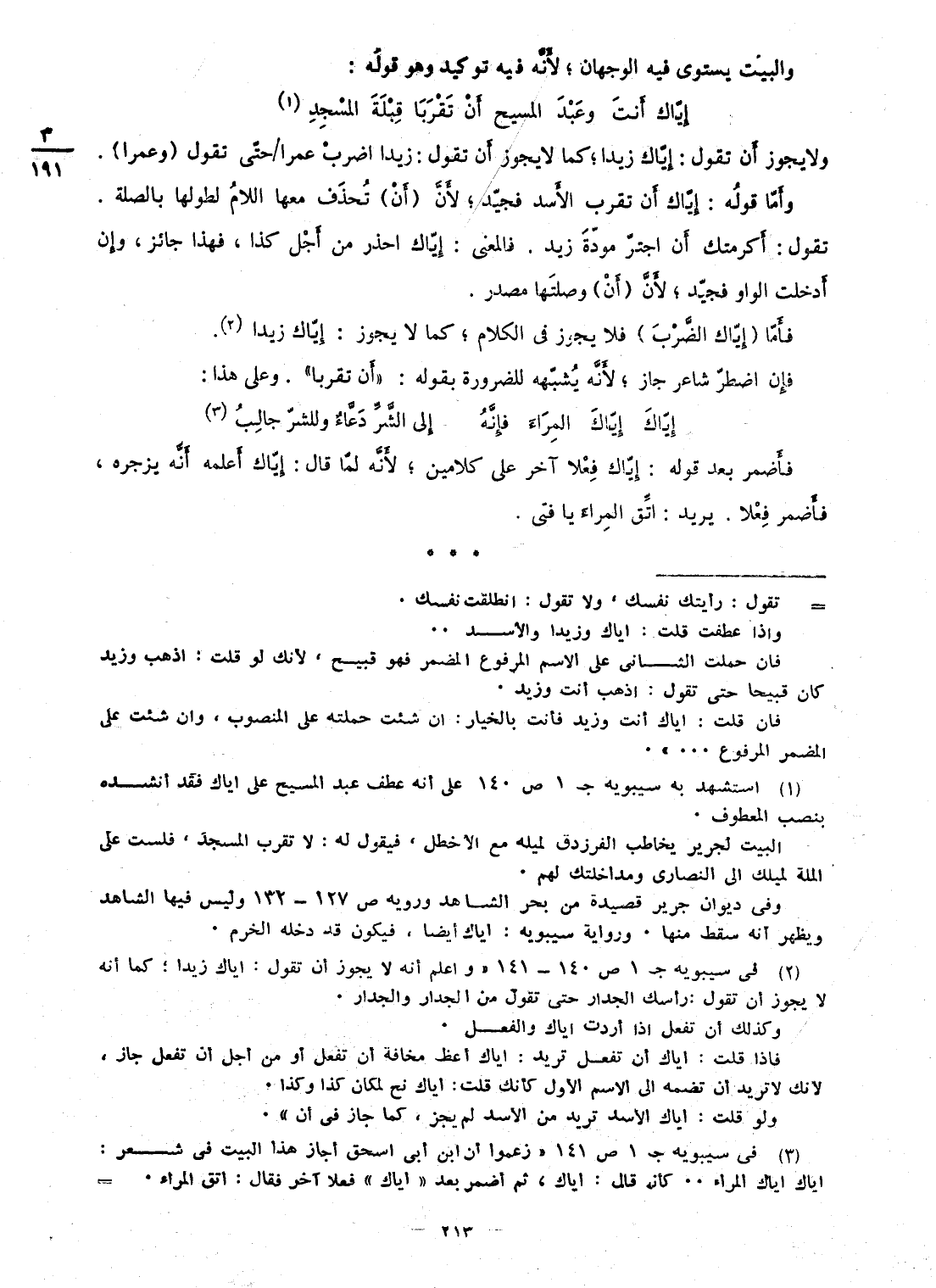 وَلَا يجوز أَن تَقول: إياك زيدا؛ كَمَا لَا يجوز أَن تَقول: زيدا اضْرِب عمرا / حَتَّى تَقول (وعمرا) وَأما قَوْله: إياك أَن تقرب الْأسد فجيد؛ لِأَن (أَن) تحذف مَعهَا اللَّام لطولها بالصلة تَقول: أكرمتك أَن اجتر مَوَدَّة زيد فَالْمَعْنى: إياك احذر من أجل كَذَا، فَهَذَا جَائِز، وَإِن أدخلت الْوَاو فجيد؛ لِأَن (أَن) وصلتها مصدر فَأَما (إياك الضَّرْب) فَلَا يجوز فى الْكَلَام؛ كَمَا لَا يجوز: إياك زيدا فَإِن اضْطر شَاعِر جَازَ؛ لِأَنَّهُ يُشبههُ للضَّرُورَة بقوله: " أَن تقربا " وعَلى هَذَا: