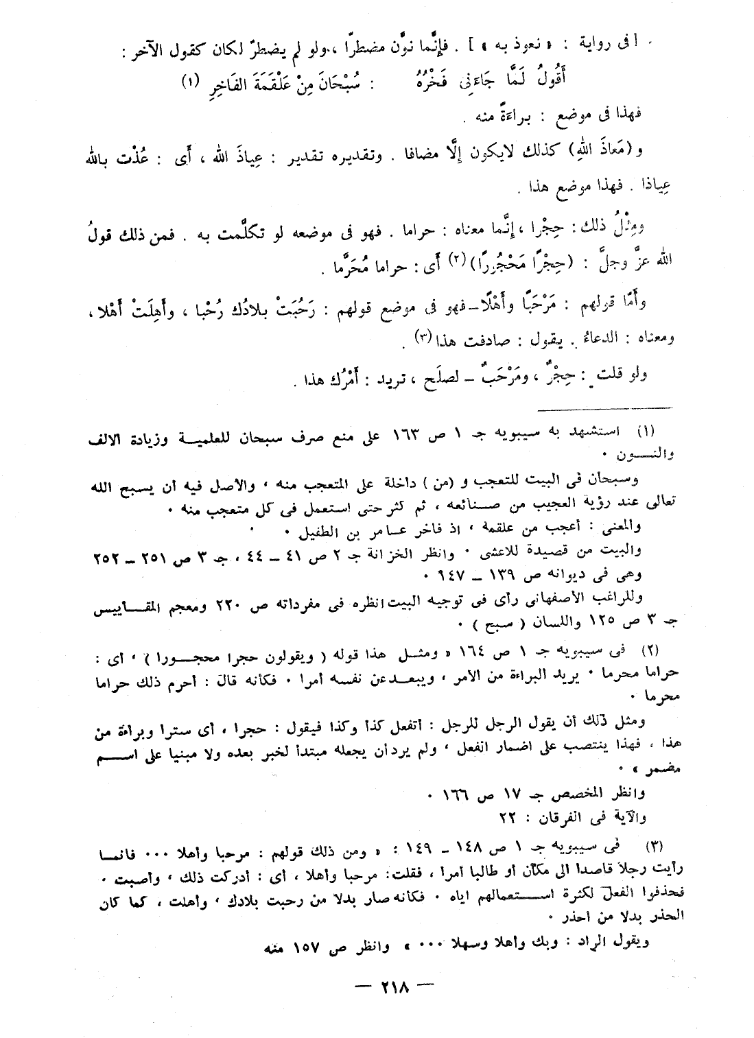فَهَذَا فى مَوضِع: بَرَاءَة مِنْهُ و (معَاذ الله) كَذَلِك لَا يكون إِلَّا مُضَافا وَتَقْدِيره تَقْدِير: عياذ الله، أى: عذت بِاللَّه عياذا فَهَذَا مَوضِع هَذَا وَمثل ذَلِك: حجرا، إِنَّمَا مَعْنَاهُ: حَرَامًا فَهُوَ فى مَوْضِعه لَو تَكَلَّمت بِهِ فَمن ذَلِك قَول الله عز وَجل: {حجرا مَحْجُورا} أى: حَرَامًا محرما وَأما قَوْلهم: مرْحَبًا وَأهلا - فَهُوَ فى مَوضِع قَوْلهم: رَحبَتْ بلادك رحبا، وأهلت أَهلا، وَمَعْنَاهُ: الدُّعَاء يَقُول: صادفت هَذَا وَلَو قلت: حجر، ومرحب - لصلح، تُرِيدُ: أَمرك هَذَا
