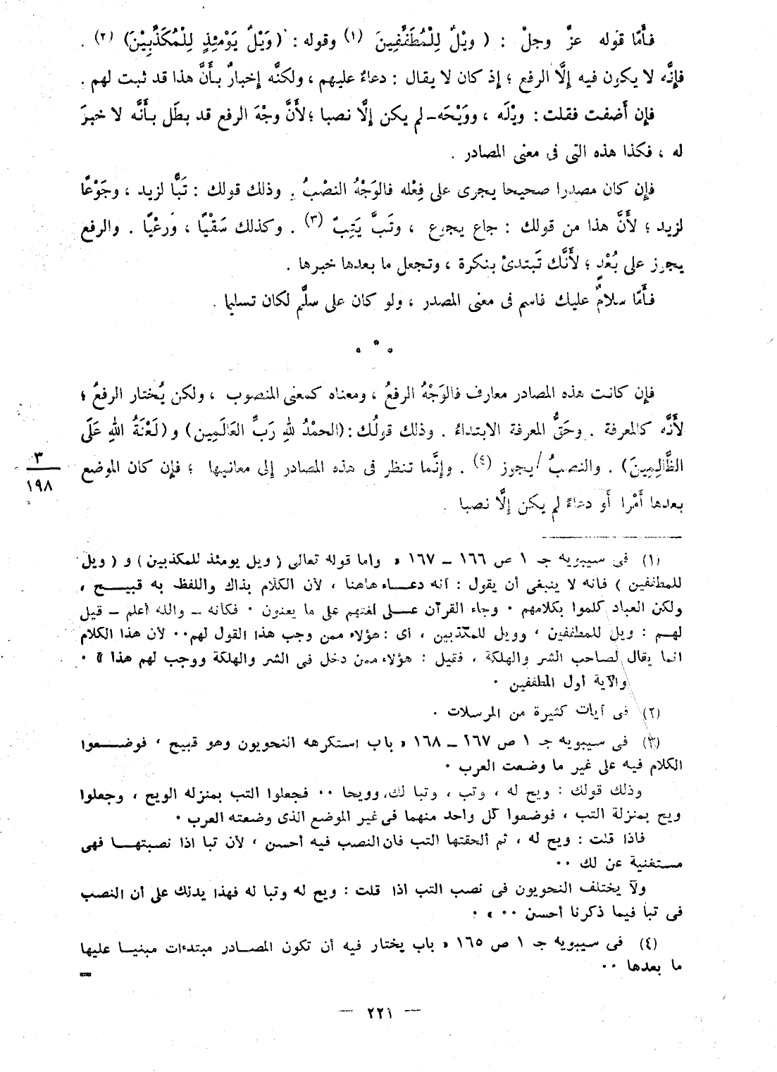 فَأَما قَوْله عز وَجل: {ويل لِلْمُطَفِّفِينَ} وَقَوله: {ويل يَوْمئِذٍ للمكذبين} فَإِنَّهُ لَا يكون فِيهِ إِلَّا الرّفْع؛ إِذْ كَانَ لَا يُقَال: دُعَاء عَلَيْهِم، وَلكنه إِخْبَار بِأَن هَذَا قد ثَبت لَهُم فَإِن أضفت فَقلت: ويله، وويحه - لم يكن إِلَّا نصبا؛ لِأَن وَجه الرّفْع قد بَطل بِأَنَّهُ لَا خبر لَهُ، فَكَذَا هَذِه الَّتِى فى معنى المصادر فَإِن كَانَ مصدرا صَحِيحا يجرى على فعله فَالْوَجْه النصب وَذَلِكَ قَوْلك: تَبًّا لزيد، وجوعا لزيد؛ لِأَن هَذَا من قَوْلك: جَاع يجوع، وَتب يتب كَذَلِك سقيا، ورعيا وَالرَّفْع يجوز على بعد؛ لِأَنَّك تبتدى بنكرة، وَتجْعَل مَا بعْدهَا خَبَرهَا فَأَما سَلام عَلَيْك فاسم فى معنى الْمصدر، وَلَو كَانَ على سلم لَكَانَ تَسْلِيمًا فَإِن كَانَت هَذِه المصادر معارف فَالْوَجْه الرّفْع، وَمَعْنَاهُ كمعنى الْمَنْصُوب، وَلَكِن يخْتَار الرّفْع؛ لِأَنَّهُ كالمعرفة وَحقّ الْمعرفَة الِابْتِدَاء وَذَلِكَ قَوْلك: {الْحَمد لله رب الْعَالمين} و {لعنة الله على الظَّالِمين} وَالنّصب / يجوز وَإِنَّمَا تنظر فى هَذِه المصادر إِلَى مَعَانِيهَا؛ فَإِن كَانَ الْموضع بعْدهَا أمرا أَو دُعَاء لم يكن إِلَّا نصبا