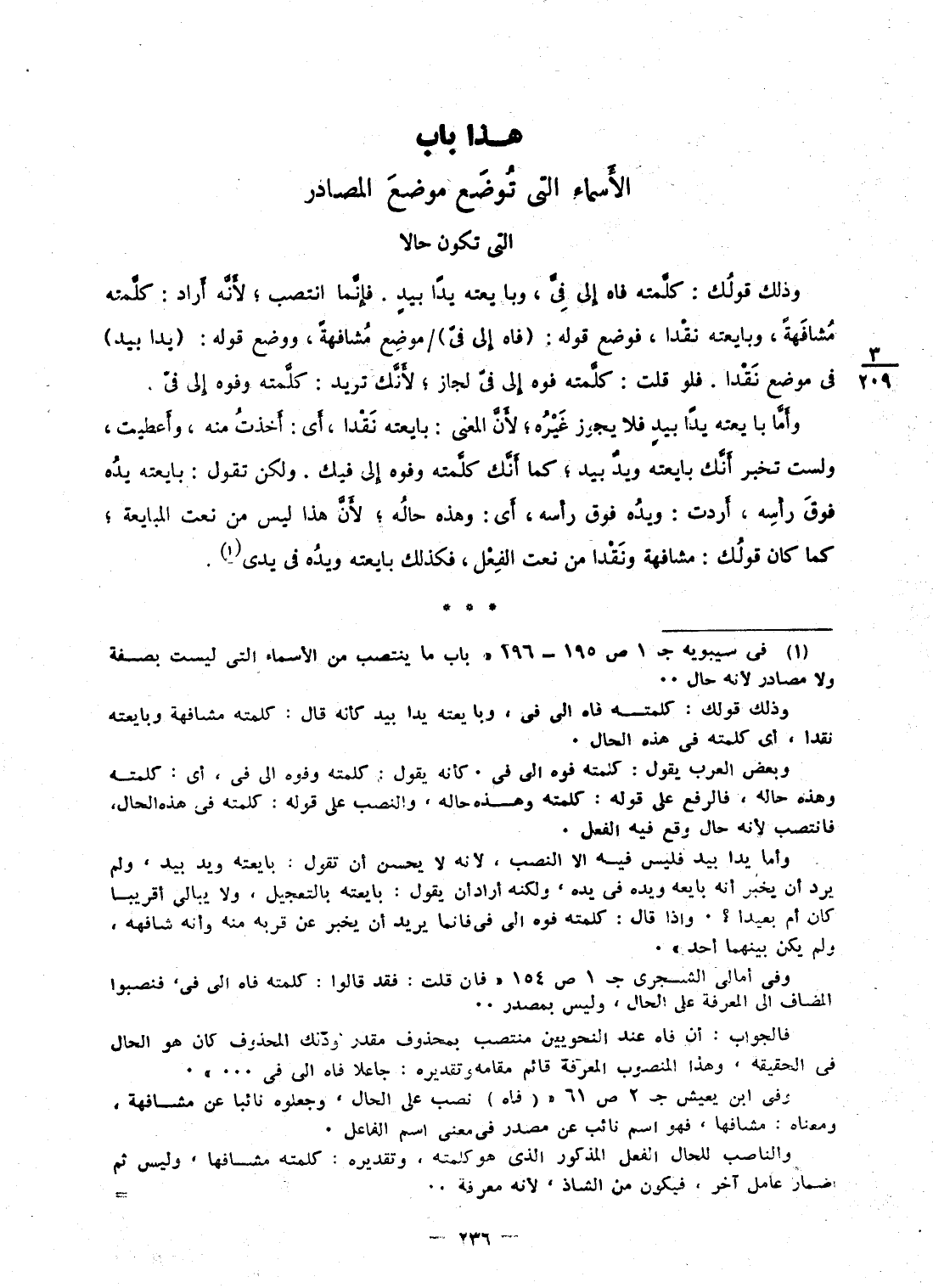 وَذَلِكَ قَوْلك: كَلمته فَاه إِلَى فى، وبايعته يدا بيد فَإِنَّمَا انتصب؛ لِأَنَّهُ أَرَادَ: كَلمته مشافهة، وبايعته نَقْدا، فَوضع قَوْله: (فَاه إِلَى فى) / مَوضِع مشافهة، وَوضع قَوْله: (يدا بيد) فى مَوضِع نَقْدا فَلَو قلت: كَلمته فوه إِلَى فى لجَاز؛ لِأَنَّك تُرِيدُ: كَلمته وفوه إِلَى فى وَأما بايعته يدا بيد فَلَا يجوز غَيره؛ لِأَن الْمَعْنى: بايعته نَقْدا، أى: أخذت مِنْهُ، وَأعْطيت، وَلست تخبر أَنَّك بايعته وَيَد بيد؛ كَمَا أَنَّك كَلمته وفوه إِلَى فِيك وَلَكِن تَقول: بايعته يَده فَوق رَأسه، أردْت: وَيَده فَوق رَأسه، أى: وَهَذِه حَاله؛ لِأَن هَذَا لَيْسَ من نعت الْمُبَايعَة؛ كَمَا كَانَ قَوْلك: مشافهة ونقدا من نعت الْفِعْل، فَكَذَلِك بايعته وَيَده فى يدى