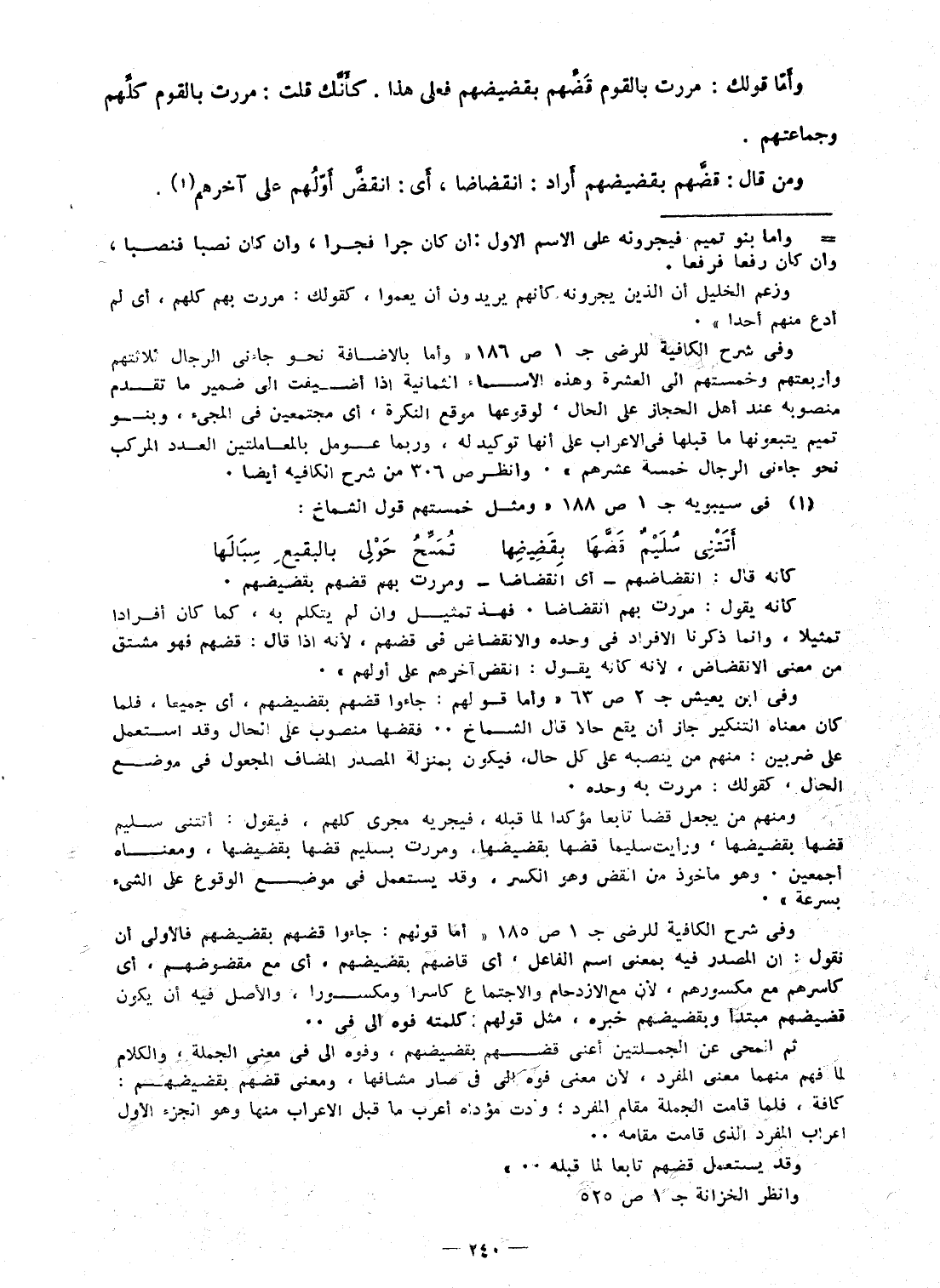 وَأما قَوْلك: مَرَرْت بالقوم قضهم بقضيضهم فعلى هَذَا كَأَنَّك قلت: مَرَرْت بالقوم كلهم وجماعتهم وَمن قَالَ: قضهم بقضيضهم أَرَادَ: انقضاضا، أى: انقض أَوَّلهمْ على آخِرهم