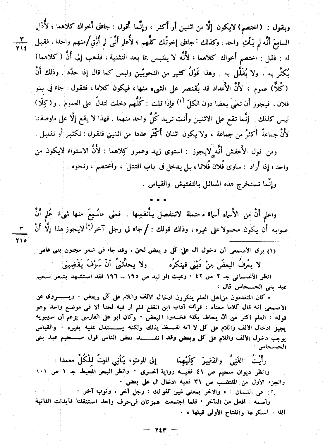 وَيَقُول: (اخْتصم) لَا يكون إِلَّا من اثْنَيْنِ أَو أَكثر، وَإِنَّمَا أَقُول: جاءنى أَخَوَاك كِلَاهُمَا؛ لأعْلم السَّامع أَنه لم يَأْتِ وَاحِد، وَكَذَلِكَ: جاءنى إخْوَتك كلهم؛ لأعْلم أَنى لم أبق / مِنْهُم وَاحِدًا، فَقيل لَهُ: فَقل: اخْتصم أَخَوَاك كِلَاهُمَا؛ لِأَنَّهُ لَا يلتبس بِمَا بعد التَّثْنِيَة، فَذهب إِلَى أَن (كِلَاهُمَا) يكثر بِهِ، وَلَا يقلل بِهِ وَهَذَا قَول كثير من النَّحْوِيين وَلَيْسَ كَمَا قَالَ إِذا حدد وَذَلِكَ أَن (كلا) عُمُوم؛ لِأَن الْأَعْدَاد قد يقْتَصر على الشئ مِنْهَا، فَيكون كلَاما، فَتَقول: جاءنى بَنو فلَان، فَيجوز أَن تعنى بَعْضًا دون الْكل فَإِذا قلت: كلهم دخلت لتدل على الْعُمُوم و (كلا) لَيْسَ كَذَلِك إِنَّمَا تقع على الِاثْنَيْنِ وَأَنت تُرِيدُ كل وَاحِد مِنْهُمَا فَهَذَا لَا يَقع إِلَّا على مَا وَصفنَا لِأَن جمَاعَة أَكثر من جمَاعَة، وَلَا يكون اثْنَان أَكثر عددا من اثْنَيْنِ فَتَقول: تَكْثِير أَو تقليل وَمن قَول الْأَخْفَش أَنه لَا يجوز: اسْتَوَى زيد وَعَمْرو كِلَاهُمَا: لِأَن الاسْتوَاء لَا يكون من وَاحِد، إِذا أَرَادَ: سَاوَى فلَان فلَانا، بل يدْخل فى بَاب اقتتل، واختصم، وَنَحْوه وَإِنَّمَا تستخرج هَذِه الْمسَائِل بالتفتيش وَالْقِيَاس وَاعْلَم أَن من الْأَسْمَاء أَسمَاء محتمله لَا تنفصل بأنفسها فَمَتَى مَا سمع مِنْهَا شئ علم أَن صَوَابه أَن يكون مَحْمُولا على غَيره، وَذَلِكَ قَوْلك: / جاءنى رجل آخر لَا يجوز هَذَا إِلَّا أَن