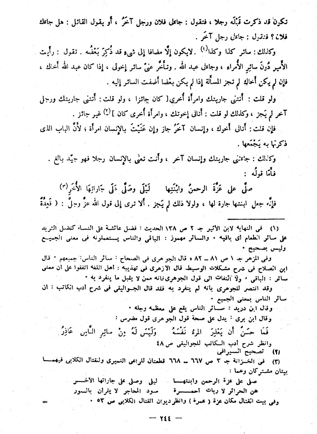 تكون قد ذكرت قبله رجلا، فَتَقول: جاءنى فلَان وَرجل آخر، أَو يَقُول الْقَائِل: هَل جَاءَك فلَان؟ فَتَقول: جاءنى رجل آخر وَكَذَلِكَ: سَائِر كَذَا وَكَذَا لَا يكون إِلَّا مُضَافا إِلَى شَيْء قد ذكر بعضه تَقول: رَأَيْت الْأَمِير دون سَائِر الْأُمَرَاء، وجاءنى عبد الله وَتَأَخر عَنى سَائِر إخواتى، إِذا كَانَ عبد الله أَخَاك، فَإِن لم يكن أَخَاك لم تجز الْمَسْأَلَة إِذا لم يكن بَعْضًا أضفت السائر إِلَيْهِ وَلَو قلت: أتتنى جاريتك وَامْرَأَة أُخْرَى [كَانَ جَائِزا، وَلَو قلت: أتتنى جاريتك وَرجل آخر لم يجز، وَكَذَلِكَ لَو قلت: أتانى إخْوَتك، وَامْرَأَة أُخْرَى كَانَ] غير جَائِز فَإِن قلت: أتانى أَخُوك، وإنسان آخر جَازَ وَإِن عنيت بالإنسان امْرَأَة؛ لِأَن الْبَاب الذى ذكرتها بِهِ يجمعها وَكَذَلِكَ: جاءتنى جاريتك وإنسان آخر، وَأَنت تعنى بالإنسان رجلا فَهُوَ جيد بَالغ فَأَما قَوْله: