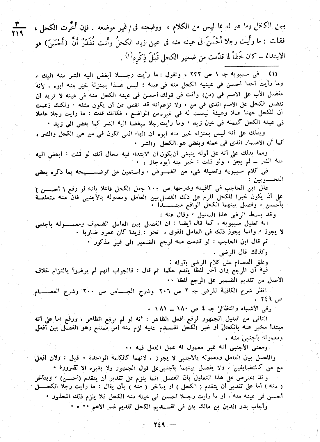 بَين الْكحل وَمَا هُوَ لَهُ بِمَا لَيْسَ من الْكَلَام، وَوَضَعته فى / غير مَوْضِعه، فَإِن أخرت الْكحل، فَقلت: مَا رَأَيْت رجلا أحسن فى عينه مِنْهُ فى عين زيد الْكحل وَأَنت تقدر أَن (أحسن) هُوَ الِابْتِدَاء - كَانَ خطأ لما قدمت من ضمير الْكحل قبل ذكره