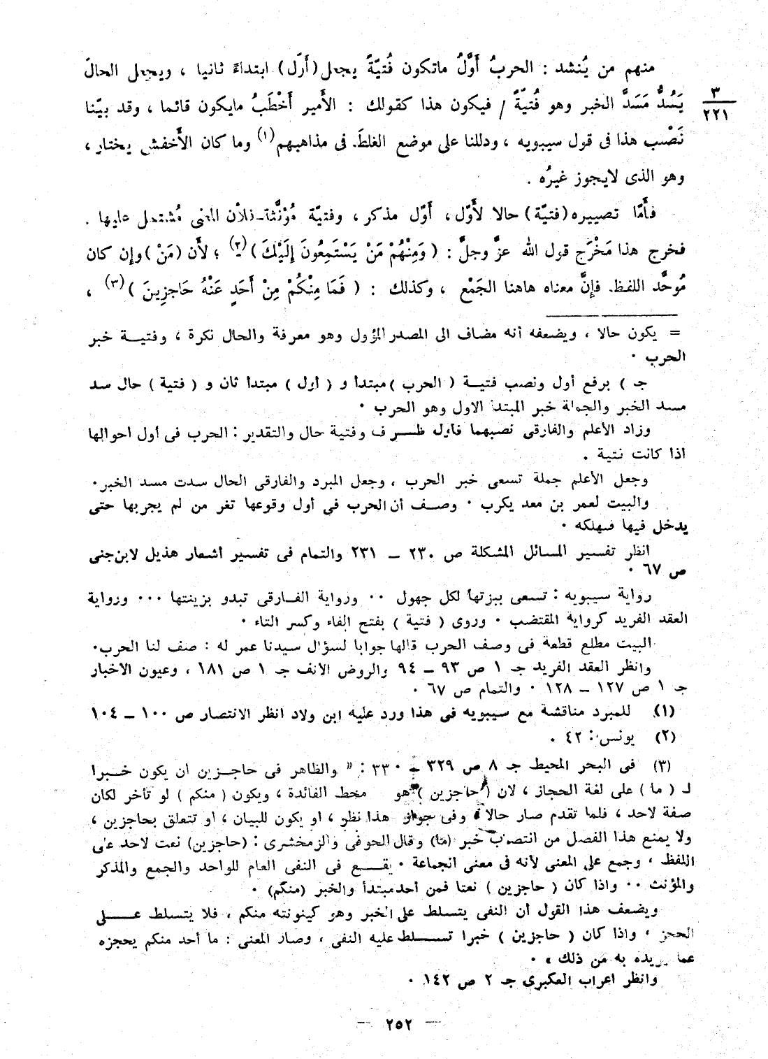 مِنْهُم من ينشد: الْحَرْب أول مَا تكون فتية يَجْعَل (أول) ابْتِدَاء ثَانِيًا، وَيجْعَل الْحَال يسد مسد الْخَبَر وَهُوَ فتية / فَيكون هَذَا كَقَوْلِك: الْأَمِير أَخطب مَا يكون قَائِما، وَقد بَينا نصب هَذَا فى قَول سِيبَوَيْهٍ، ودللنا على مَوضِع الْغَلَط فى مذاهبهم وَمَا كَانَ الْأَخْفَش يخْتَار، وَهُوَ الذى لَا يجوز غَيره فَأَما تصييره (فتية) حَالا لأوّل، أول مُذَكّر، وفتية مُؤَنّثَة - فَلِأَن الْمَعْنى مُشْتَمل عَلَيْهَا فَخرج هَذَا مخرج قَول الله عز وَجل: {وَمِنْهُم من يَسْتَمِعُون إِلَيْك} ؛ لِأَن (مَنْ) وَإِن كَانَ موحد اللَّفْظ فَإِن مَعْنَاهُ هَاهُنَا الْجمع، وَكَذَلِكَ: {فَمَا مِنْكُم من أحد عَنهُ حاجزين}