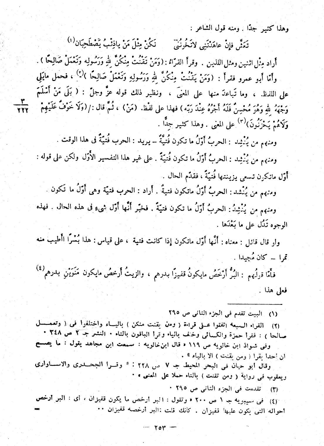 أَرَادَ مثل اثْنَيْنِ وَمثل اللَّذين وَقَرَأَ الْقُرَّاء: {وَمَنْ تَقنُتْ مِنْكنَّ لله وَرَسُولِه وَتَعْمَل صَالِحاً} وَأما أَبُو عَمْرو فَقَرَأَ: {وَمن يقنت مِنْكُن لله وَرَسُوله وتعمل صَالحا} ، فَحمل مَا يلى على اللَّفْظ، وَمَا تبَاعد مِنْهَا على الْمَعْنى، وَنَظِير قَوْله عز وَجل: {بلَى من أسلم وَجهه لله وَهُوَ محسن فَلهُ أجره عِنْد ربه} فَهَذَا على لفظ (مَنْ) ، ثمَّ قَالَ: / {وَلَا خوف عَلَيْهِم وَلَا هم يَحْزَنُونَ} على الْمَعْنى وَهَذَا كثير جدا وَمِنْهُم من ينشد: الْحَرْب أول مَا تكون فتية - يُرِيد: الْحَرْب فتية فى هَذَا الْوَقْت وَمِنْهُم من ينشد: الْحَرْب أول مَا تكون فتية على غير هَذَا التَّفْسِير الأول وَلَكِن على قَوْله: أول مَا تكون تسْعَى يزينتها فتية، فَقدم الْحَال وَمِنْهُم من ينشد: الْحَرْب أول مَا تكون فتية أَرَادَ: الْحَرْب فتية وهى أول مَا تكون وَمِنْهُم من ينشد: الْحَرْب أول مَا تكون فتية فخبر أَنَّهَا أول شئ فى هَذِه الْحَال فَهَذِهِ الْوُجُوه تدل على مَا بعْدهَا وَلَو قَالَ قَائِل: مَعْنَاهُ: أَنَّهَا أول مَا تكون إِذا كَانَت فتية، على قِيَاس: هَذَا بسرا أطيب مِنْهُ تَمرا - كَانَ مجيدا فَأَما قَوْلهم: الْبر أرخص مَا يكون قَفِيزا بدرهم، وَالزَّيْت أرخص مَا يكون منوين دِرْهَم فعلى هَذَا