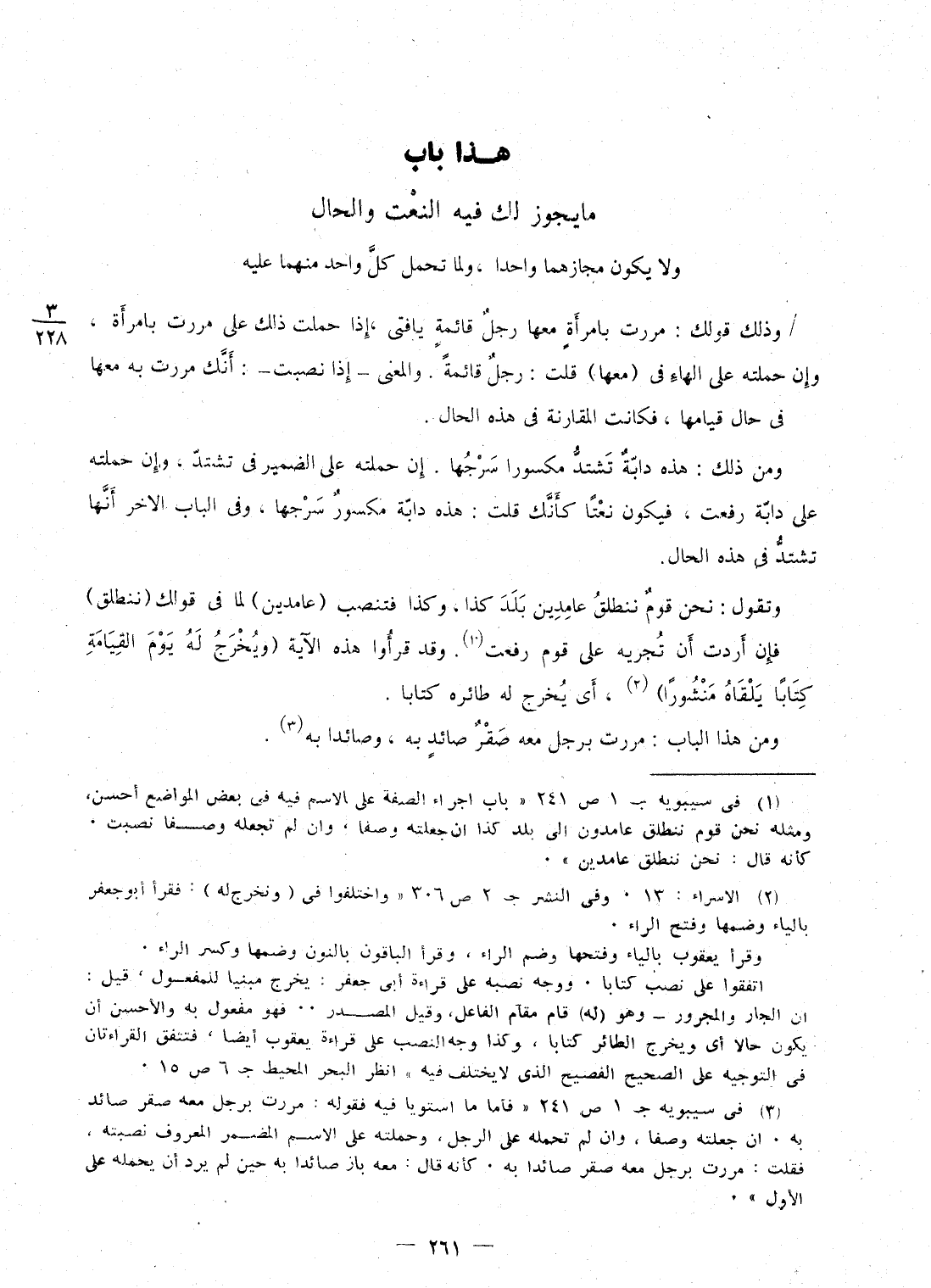 / وَذَلِكَ قَوْلك: مَرَرْت بِامْرَأَة مَعهَا رجل قامة يَا فَتى، إِذا حملت ذَلِك على مَرَرْت بِامْرَأَة، وَإِن حَملته على الْهَاء فى (مَعهَا) قلت: رجل قَائِمَة وَالْمعْنَى - إِذا نصبت -: أَنَّك مَرَرْت بِهِ مَعهَا فى حَال قِيَامهَا، فَكَانَت الْمُقَارنَة فى هَذِه الْحَال وَمن ذَلِك: هَذِه دَابَّة تشتد مكسورا سرجها إِن حَملته على الضَّمِير فى تشتد، وَإِن حَملته على دَابَّة رفعت، فَيكون نعتا كَأَنَّك قلت: هَذِه دابه مكسور سرجها، وفى الْبَاب الاخر أَنَّهَا تشتد فى هَذِه الْحَال وَتقول: نَحن قوم ننطلق عَامِدين بلد كَذَا، وَكَذَا فتنصب (عَامِدين) لما فى قَوْلك (ننطلق) فَإِن أردْت أَن تجربه على قوم رفعت وَقد قرأوا هَذِه الْآيَة {ويُخْرَجُ لَهُ يَوْمَ القِيَامَةِ كِتَاباً يَلْقَاهُ مَنشُوراً} ، أى يخرج لَهُ طَائِره كتابا وَمن هَذَا الْبَاب: مَرَرْت بِرَجُل مَعَه صقر صائد بِهِ، وصائدا بِهِ
