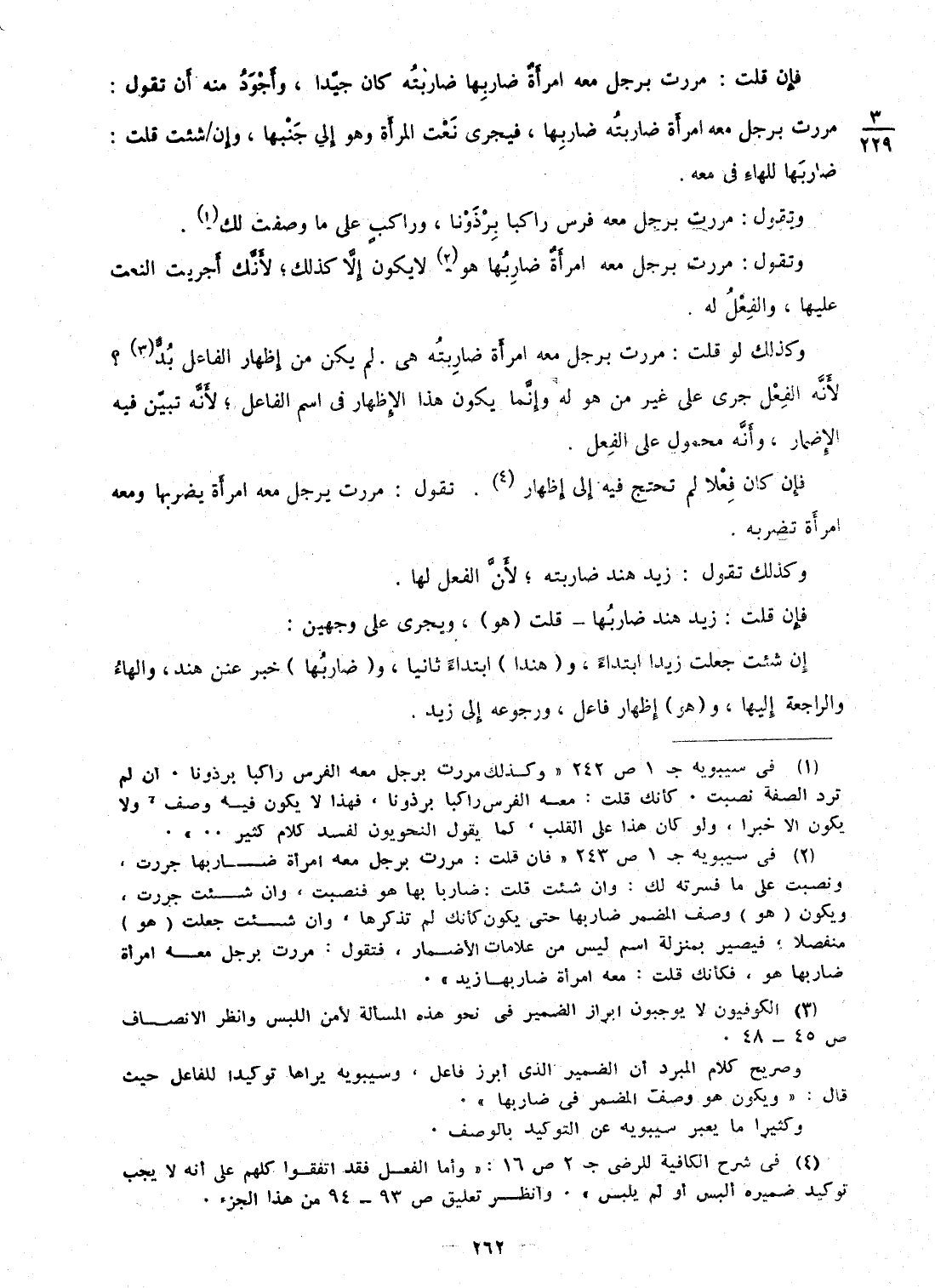 فَإِن قلت: مَرَرْت بِرَجُل مَعَه امْرَأَة ضاربته كَانَ جيدا، وأجود مِنْهُ أَن تَقول: مَرَرْت بِرَجُل مَعَه امْرَأَة ضاربته ضاربها هُوَ لَا يكون إِلَّا كَذَلِك؛ لِأَنَّك أجريت النَّعْت عَلَيْهَا، وَالْفِعْل لَهُ وَكَذَلِكَ لَو قلت: مَرَرْت بِرَجُل مَعَه امْرَأَة ضاربته هى لم يكن من إِظْهَار الْفَاعِل بُد؟ لِأَنَّهُ الْفِعْل جرى على غير من هُوَ لَهُ وَإِنَّمَا يكون هَذَا الْإِظْهَار فى اسْم الْفَاعِل؛ لِأَنَّهُ تبين فِيهِ الاضمار الْإِضْمَار، وَأَنه مَحْمُول على الْفِعْل فَإِن كَانَ فعلا لم تحتج فِيهِ إِلَى إِظْهَار تَقول: مَرَرْت يرجل مَعَه امْرأ يضْربهَا وَمَعَهُ امْرَأَة تضربه وَكَذَلِكَ تَقول: زيد هِنْد ضاربته؛ لِأَن الْفِعْل لَهَا فَإِن قلت: زيد هِنْد ضاربها - قلت (هُوَ) ، ويجرى على وَجْهَيْن: إِن شِئْت جعلت زيدا ابْتِدَاء، و (هندا) ابْتِدَاء ثَانِيًا، و (ضاربها) خبر عنن هِنْد، وَالْهَاء والراجعة إِلَيْهَا، و (هُوَ) إِظْهَار فَاعل، ورجوعه إِلَى زيد
