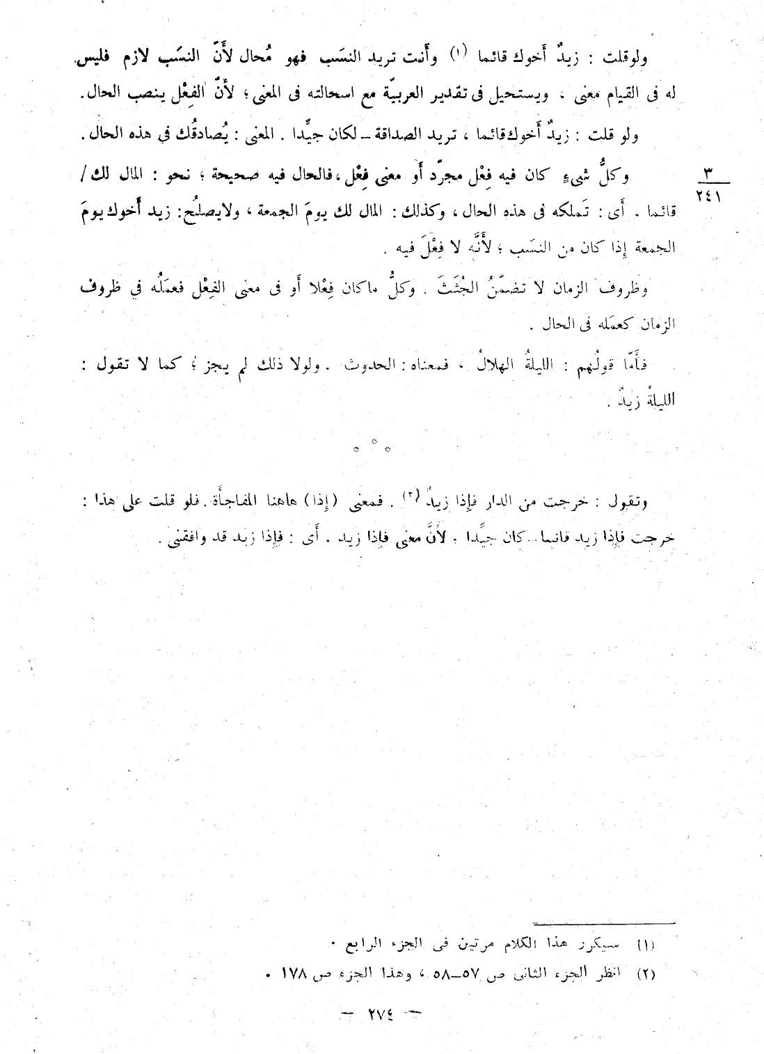 وَلَو قلت: زيد أَخُوك قَائِما وَأَنت تُرِيدُ النّسَب فَهُوَ محَال لِأَن النّسَب لَازم فَلَيْسَ لَهُ فى الْقيام معنى، ويستحيل فى تَقْدِير الْعَرَبيَّة مَعَ اسحالته فى الْمَعْنى؛ لِأَن الْفِعْل ينصب الْحَال وَلَو قلت: زيد أَخُوك قَائِما، تُرِيدُ الصداقة - لَكَانَ جيدا الْمَعْنى: يصادقك فى هَذِه الْحَال وكل شئ كَانَ فِيهِ فعل مُجَرّد أَو معنى فعل، فالحال فِيهِ صَحِيحَة؛ نَحْو: المَال لَك / قَائِما، أى: تملكه فى هَذِه الْحَال، وَكَذَلِكَ: المَال لَك يَوْم الْجُمُعَة، وَلَا يصلح: زيد أَخُوك يَوْم الْجُمُعَة إِذا كَانَ من النّسَب؛ لِأَنَّهُ لَا فعل فِيهِ وظروف الزَّمَان لَا تضمن الجثث وكل مَا كَانَ فعلا أَو فى معنى الْفِعْل فعله فى ظروف الزَّمَان كعمله فى الْحَال فَأَما قَوْلهم: اللَّيْلَة الْهلَال، فَمَعْنَاه: الْحُدُوث، وَلَوْلَا ذَلِك لم يجز؛ كَمَا لَا تَقول: اللَّيْلَة زيد وَتقول: خرجت من الدَّار فَإِذا زيد فَمَعْنَى (إِذْ) هَاهُنَا المفاجأة فَلَو قلت على هَذَا: خرجت فَإِذا زيد قَائِما كَانَ جيدا؛ لِأَن معنى فَإِذا، أى: فَإِذا زيد قد وافقنى
