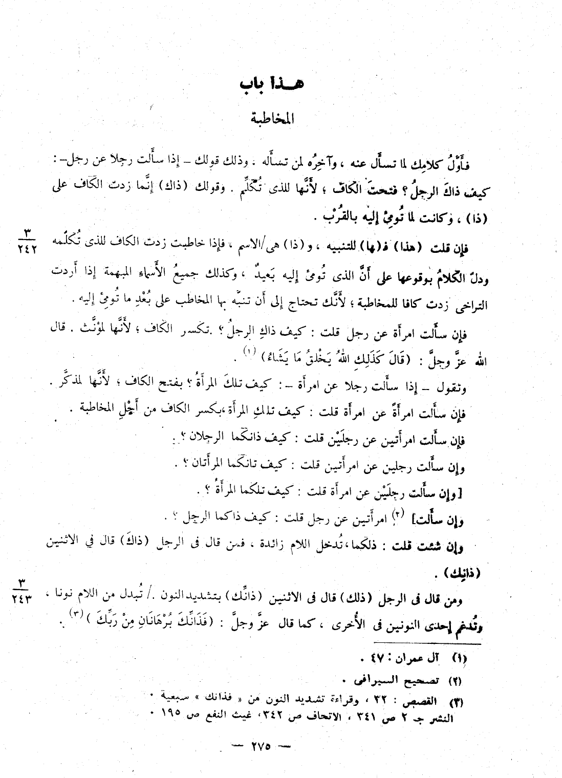 فَأول كلامك لما تسْأَل عَنهُ، وَآخره لمن تسأله، وَذَلِكَ قَوْلك - إِذا سَأَلت رجلا عَن رجل -: كَيفَ ذَاك الرجل؟ فتحت الْكَاف؛ لِأَنَّهَا للذى تكلم وقولك (ذَاك) إِنَّمَا زِدْت الْكَاف على (ذَا) ، وَكَانَت لما تومئ إِلَيْهِ بِالْقربِ فَإِن قلت (هَذَا) ف (هَا) للتّنْبِيه، و (ذَا) هى / الِاسْم، فَإِذا خاطبت زِدْت الْكَاف للذى تكَلمه وَدلّ الْكَلَام بوقوعها على أَن الذى تومئ إِلَيْهِ بعيد، وَكَذَلِكَ جَمِيع الْأَسْمَاء المبهمة إِذا أردْت التراخى زِدْت كافا للمخاطبة؛ لِأَنَّك تحْتَاج إِلَى أَن تنبه بهَا الْمُخَاطب على بعد مَا تومئ إِلَيْهِ فَإِن سَأَلت امْرأ عَن رجل قلت: كَيفَ ذَاك الرجل؟ تكسر الْكَاف؛ لِأَنَّهَا لمؤنث قَالَ الله عز وَجل: {قَالَ كَذَلِك الله يخلق مَا يَشَاء} وَتقول - إِذا سَأَلت رجلا عَن امْرَأَة -: كَيفَ تِلْكَ الْمَرْأَة؟ بِفَتْح الْكَاف؛ لِأَنَّهَا لمذكر فَإِن سَأَلت امْرَأَة عَن امْرَأَة قلت: كَيفَ تِلْكَ الْمَرْأَة، بِكَسْر الْكَاف من أجل المخاطبة فَإِن سَأَلت امْرَأتَيْنِ عَن رجلَيْنِ قلت: كَيفَ ذانكما الرّجلَانِ؟ وَإِن سَأَلت رجلَيْنِ عَن إمراتين قلت: كَيفَ تانكما الْمَرْأَتَانِ؟ [وَإِن سَأَلت رجلَيْنِ عَن امْرَأَة قلت: كَيفَ تلكما الْمَرْأَة؟ وَإِن سَأَلت] امْرَأتَيْنِ عَن رجل قلت: كَيفَ ذاكما الرجل؟ وَإِن شِئْت قلت: ذلكما، تدخل اللَّام زَائِدَة، فَمن قَالَ فى الرجل (ذَاك) قَالَ فى الِاثْنَيْنِ (ذَانك) وَمن قَالَ فى الرجل (ذَلِك) قَالَ فى الِاثْنَيْنِ (ذَانك) بتَشْديد النُّون / تبدل من اللَّام نونا، وتدغم إِحْدَى النونين فى الْأُخْرَى، كَمَا قَالَ عز وَجل: {فذانك برهانان من رَبك}